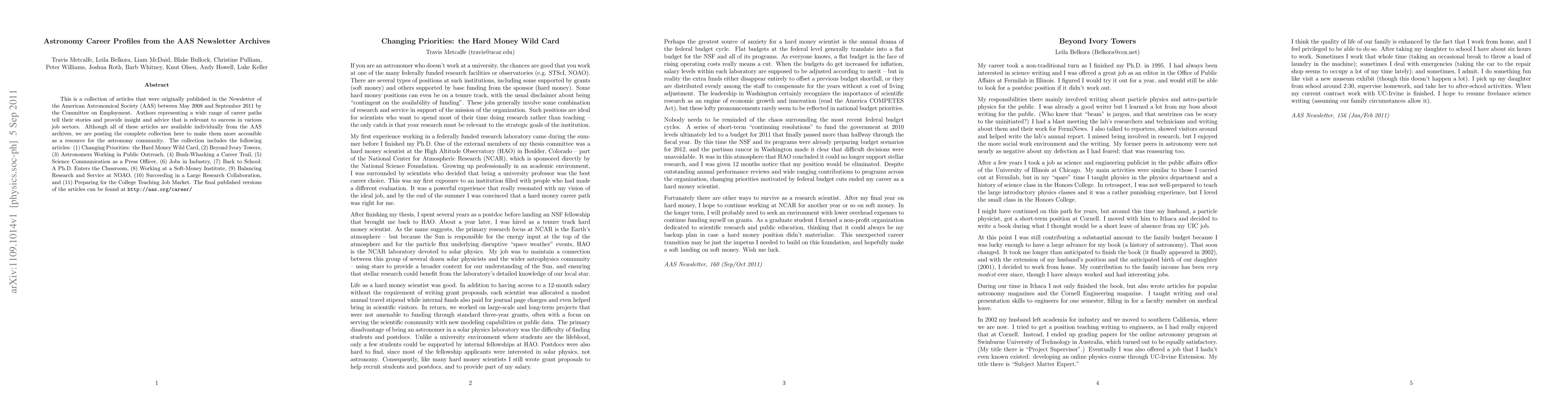 This collection of articles from the American Astronomical Society newsletter offers diverse career stories and advice for astronomers, highlighting various professional paths beyond traditional research roles. It aims to serve as an accessible resource for those exploring or advancing careers in astronomy and related fields.