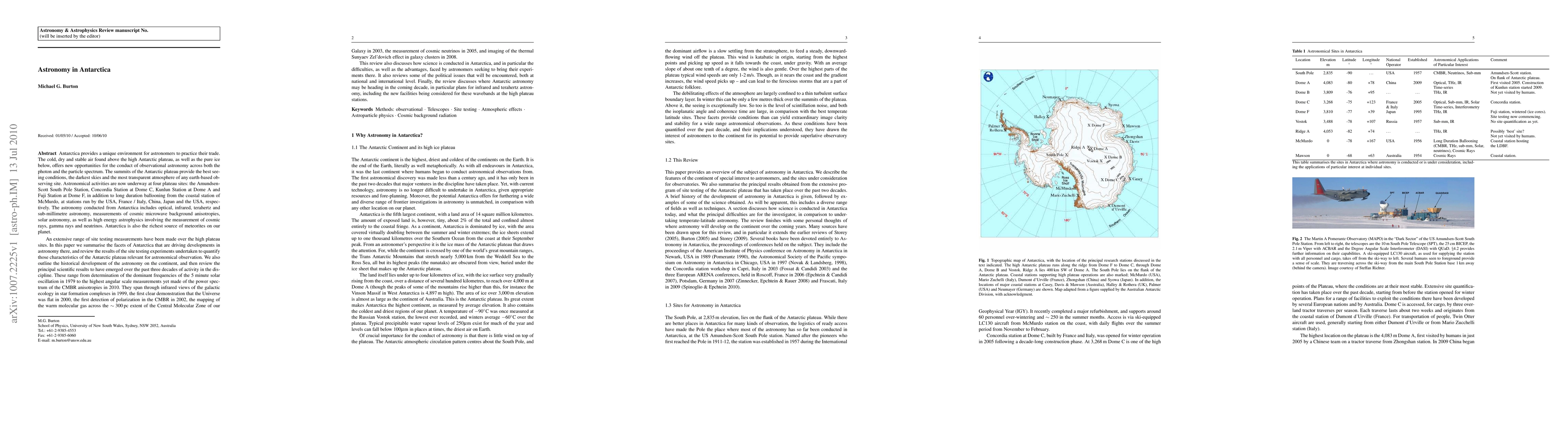 Antarctica's unique cold, dry, and stable atmosphere offers unparalleled conditions for diverse astronomical observations across various spectra, with significant activities underway at several high plateau sites. This paper reviews the historical development, scientific achievements, and future prospects of astronomy in Antarctica, including the challenges and political considerations involved.