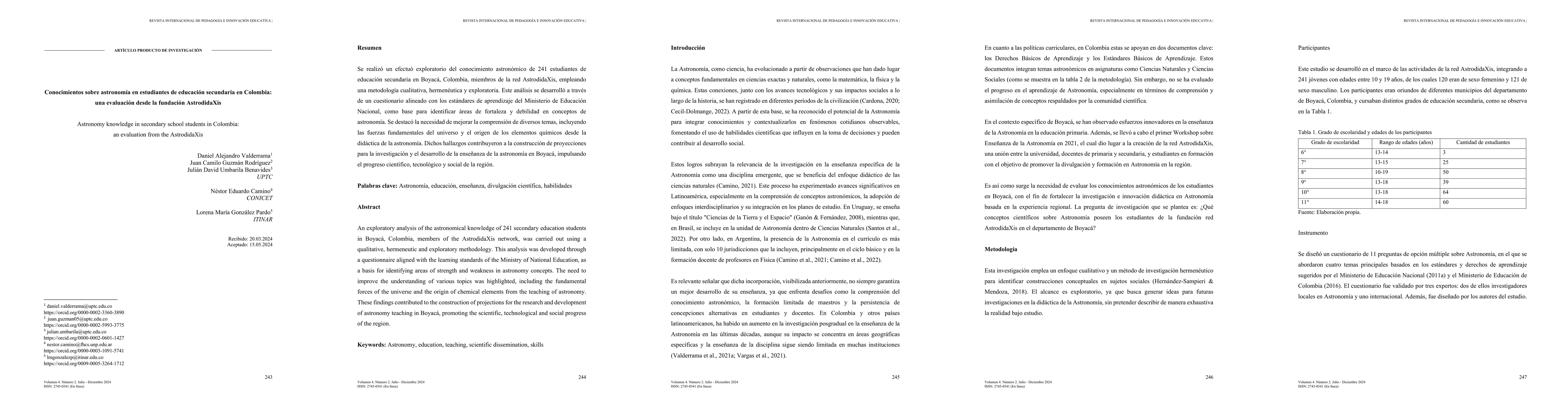 An exploratory analysis of the astronomical knowledge of 241 secondary education students in Boyac\'a, Colombia, members of the AstrodidaXis network, was carried out using a qualitative, hermeneutic and exploratory methodology. This analysis was developed through a questionnaire aligned with the learning standards of the Ministry of National Education, as a basis for identifying areas of strength and weakness in astronomy concepts. The need to improve the understanding of various topics was highlighted, including the fundamental forces of the universe and the origin of chemical elements from the teaching of astronomy. These findings contributed to the construction of projections for the research and development of astronomy teaching in Boyac\'a, promoting the scientific, technological and social progress of the region.