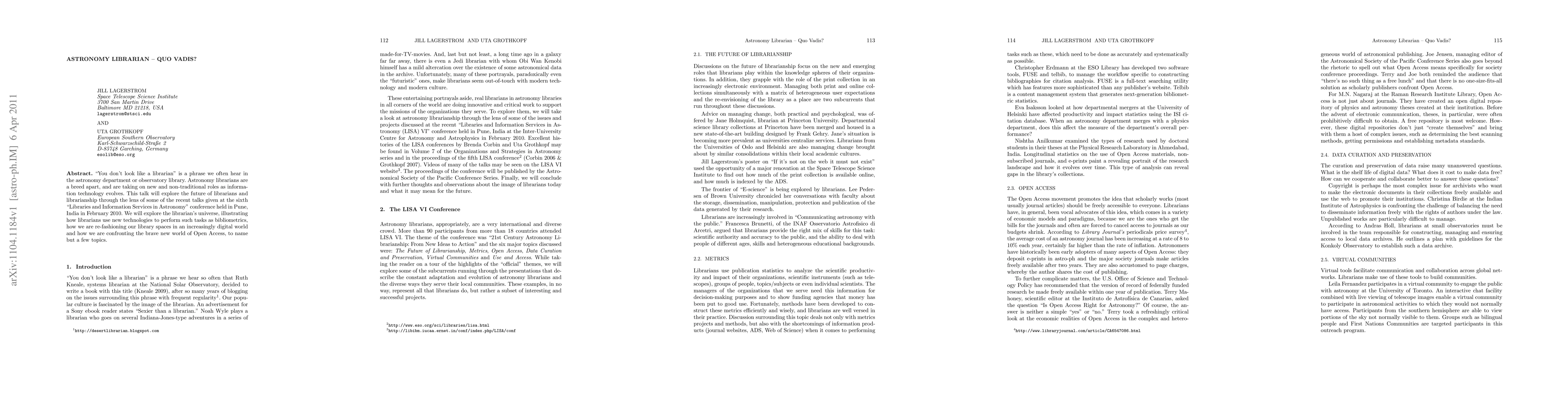 This paper explores the future of librarianship in astronomy, focusing on new technologies, digital library spaces, and open access, to adapt to a changing field.