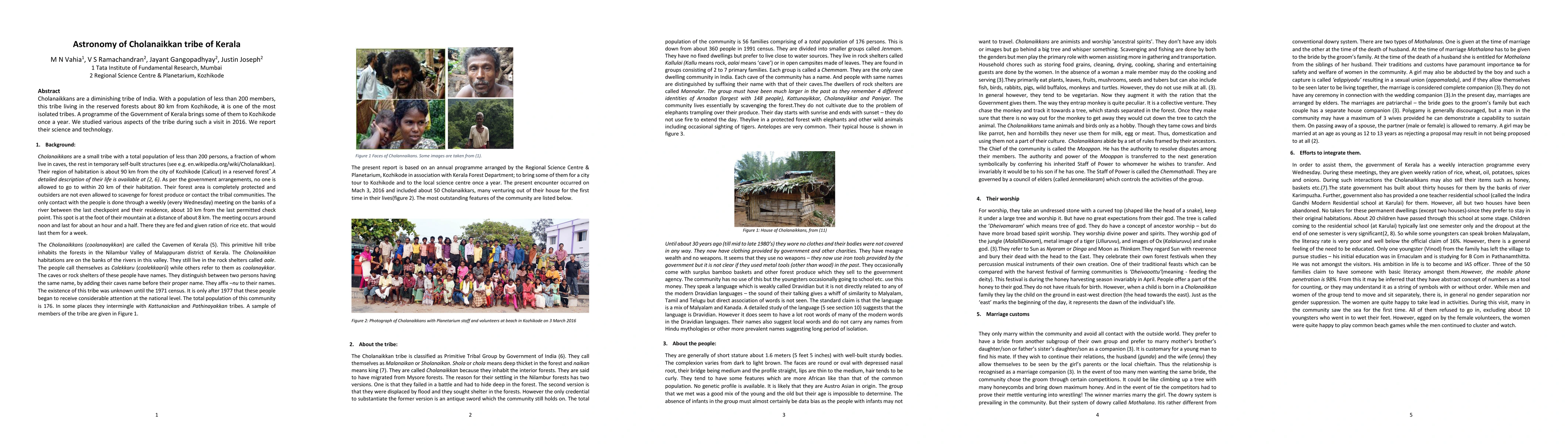 Cholanaikkans are a diminishing tribe of India. With a population of less than 200 members, this tribe living in the reserved forests about 80 km from Kozhikode, it is one of the most isolated tribes. A programme of the Government of Kerala brings some of them to Kozhikode once a year. We studied various aspects of the tribe during such a visit in 2016. We report their science and technology.