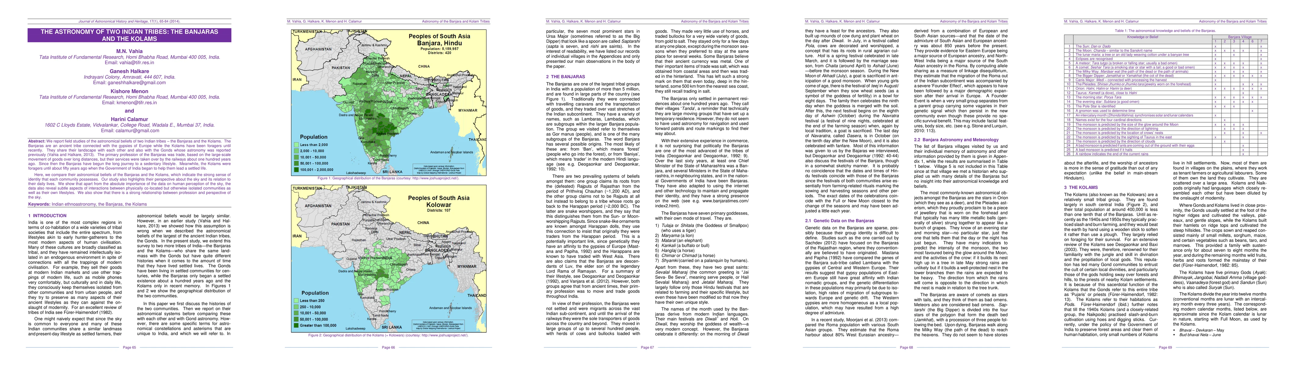 We report field studies of the astronomical beliefs of two Indian tribes: the Banjaras and the Kolams. The Banjaras are an ancient tribe connected with the gypsies of Europe while the Kolams have been foragers until recently. They share their landscape with each other and also with the Gonds whose astronomy was reported previously (Vahia and Halkare, 2013). The primary profession of the Banjaras was trade, based on the large-scale movement of goods over long distances, but their services were taken over by the railways about one hundred years ago. Since then the Banjaras have begun the long journey to a sedentary lifestyle. Meanwhile, the Kolams were foragers until about fifty years ago when the Government of India began to help them lead a settled life. Here, we compare their astronomical beliefs of the Banjaras and the Kolams, which indicate the strong sense of identity that each community possesses. Our study also highlights their perspective about the sky and its relation to their daily lives. We show that apart from the absolute importance of the data on human perception of the sky, the data also reveal subtle aspects of interactions between physically co-located but otherwise isolated communities as well as their own lifestyles. We also show that there is a strong relationship between profession and perspective of the sky.