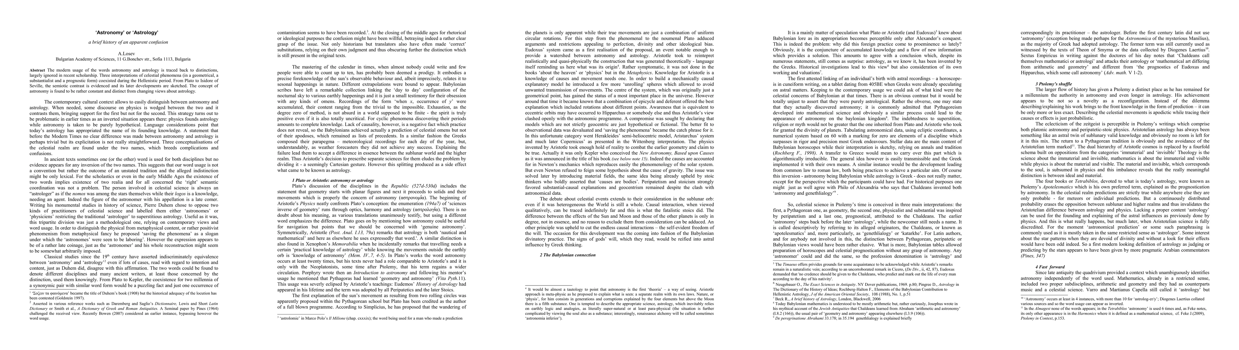 The modern usage of the words astronomy and astrology is traced back to distinctions, largely ignored in recent scholarship. Three interpretations of celestial phenomena (in a geometric, a substantialist and a prognostic versions) coexisted during the Hellenistic period. From Plato to Isidore of Seville, semantic changes are evidenced and their later development is sketched.