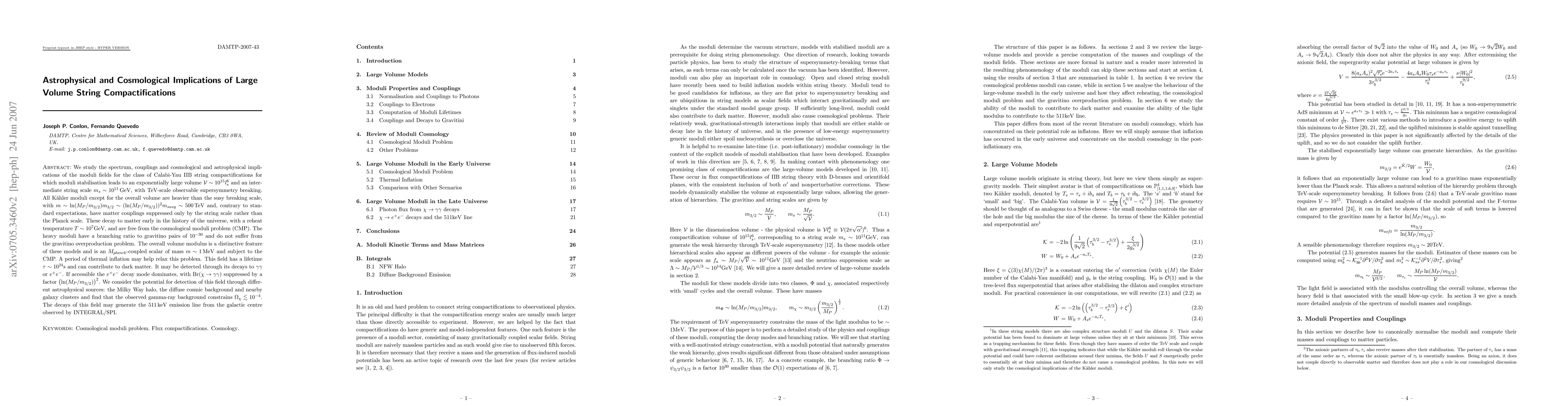 This paper explores the cosmological and astrophysical implications of large volume string compactifications in Calabi-Yau IIB models, where moduli stabilization leads to an exponentially large volume and intermediate string scale. The heavy moduli decay early in the universe's history, potentially contributing to dark matter and detectable through gamma-ray emissions.
