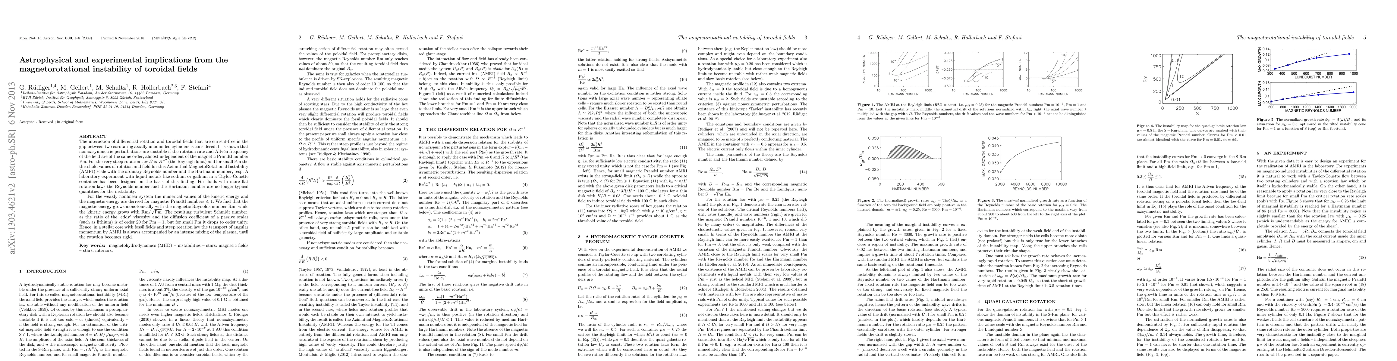 The interaction of differential rotation and toroidal fields that are current-free in the gap between two corotating axially unbounded cylinders is considered. It is shown that nonaxisymmetric perturbations are unstable if the rotation rate and Alfv\'en frequency of the field are of the same order, almost independent of the magnetic Prandtl number Pm. For the very steep rotation law \Omega\propto R^{-2} (the Rayleigh limit) and for small Pm the threshold values of rotation and field for this Azimuthal MagnetoRotational Instability (AMRI) scale with the ordinary Reynolds number and the Hartmann number, resp. A laboratory experiment with liquid metals like sodium or gallium in a Taylor-Couette container has been designed on the basis of this finding. For fluids with more flat rotation laws the Reynolds number and the Hartmann number are no longer typical quantities for the instability. For the weakly nonlinear system the numerical values of the kinetic energy and the magnetic energy are derived for magnetic Prandtl numbers \leq 1. We find that the magnetic energy grows monotonically with the magnetic Reynolds number Rm, while the kinetic energy grows with Rm/\sqrt{Pm}. The resulting turbulent Schmidt number, as the ratio of the `eddy' viscosity and the diffusion coefficient of a passive scalar (such as lithium) is of order 20 for Pm=1, but for small Pm it drops to order unity. Hence, in a stellar core with fossil fields and steep rotation law the transport of angular momentum by AMRI is always accompanied by an intense mixing of the plasma, until the rotation becomes rigid.