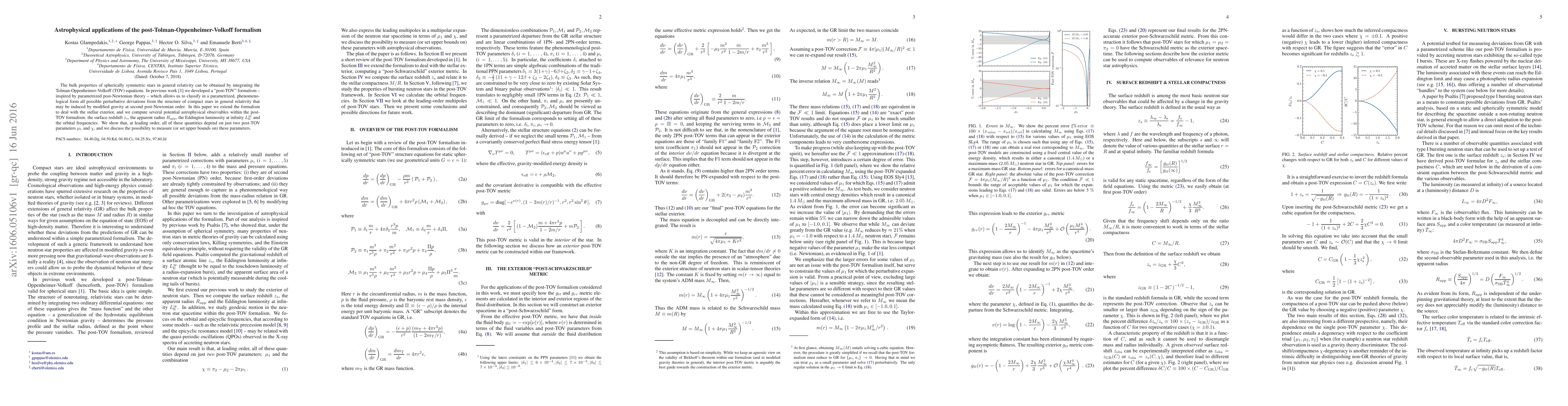 The bulk properties of spherically symmetric stars in general relativity can be obtained by integrating the Tolman-Oppenheimer-Volkoff (TOV) equations. In previous work we developed a "post-TOV" formalism - inspired by parametrized post-Newtonian theory - which allows us to classify in a parametrized, phenomenological form all possible perturbative deviations from the structure of compact stars in general relativity that may be induced by modified gravity at second post-Newtonian order. In this paper we extend the formalism to deal with the stellar exterior, and we compute several potential astrophysical observables within the post-TOV formalism: the surface redshift $z_s$, the apparent radius $R_{\rm app}$, the Eddington luminosity at infinity $L_{\rm E}^\infty$ and the orbital frequencies. We show that, at leading order, all of these quantities depend on just two post-TOV parameters $\mu_1$ and $\chi$, and we discuss the possibility to measure (or set upper bounds on) these parameters.