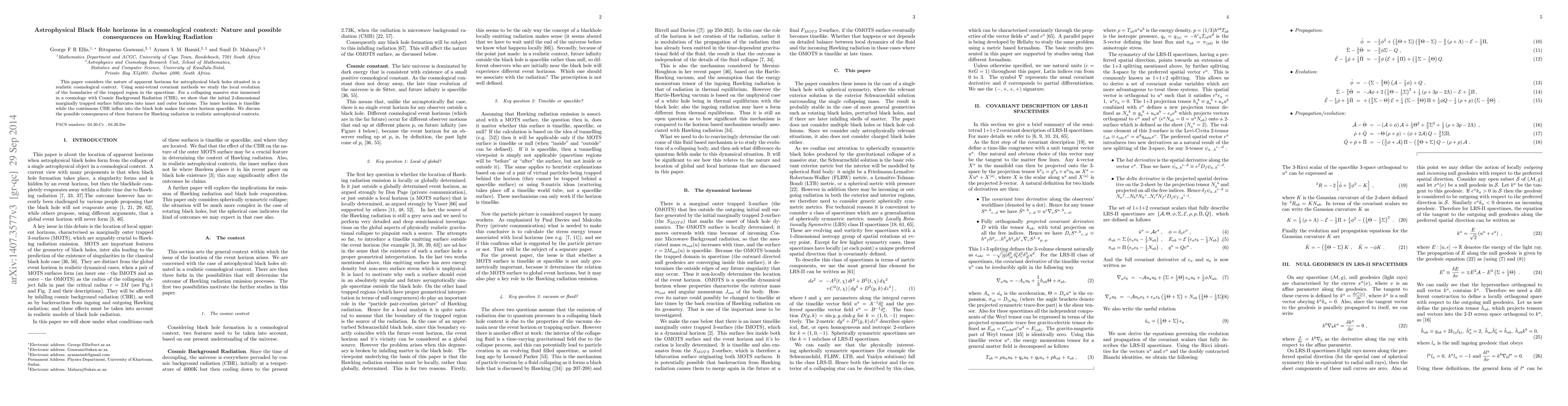 This paper considers the nature of apparent horizons for astrophysical black hole situated in a realistic cosmological context. Using semi-tetrad covariant methods we study the local evolutions of the boundaries of the trapped region in the spacetime. For a collapsing massive star immersed in a cosmology with Cosmic Background Radiation (CBR), we show that the initial 2 dimensional marginally trapped surface bifurcates into inner and outer horizons. The inner horizon is timelike while the continuous CBR influx into the black hole makes the outer horizon spacelike. We discuss the possible consequences of these features for Hawking radiation in realistic astrophysical contexts.