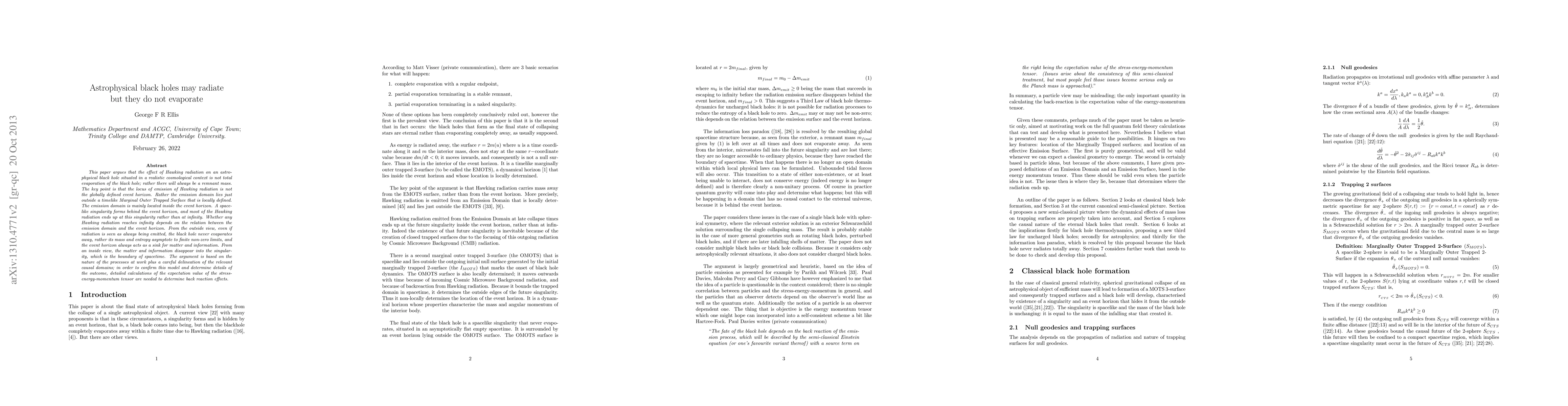 This paper argues that the effect of Hawking radiation on an astrophysical black hole situated in a realistic cosmological context is not total evaporation of the black hole; rather there will always be a remnant mass. The key point is that the locus of emission of Hawking radiation is not the globally defined event horizon. Rather the emission domain lies just outside a timelike Marginal Outer Trapped Surface that is locally defined. The emission domain is mainly located inside the event horizon. A spacelike singularity forms behind the event horizon, and most of the Hawking radiation ends up at this singularity rather than at infinity. Whether any Hawking radiation reaches infinity depends on the relation between the emission domain and the event horizon. From the outside view, even if radiation is seen as always being emitted, the black hole never evaporates away, rather its mass and entropy asymptote to finite non-zero limits, and the event horizon always acts as a sink for matter and information. From an inside view, the matter and information disappear into the singularity, which is the boundary of spacetime. The argument is based on the nature of the processes at work plus a careful delineation of the relevant causal domains; in order to confirm this model and determine details of the outcome, detailed calculations of the expectation value of the stress-energy-momentum tensor are needed to determine back reaction effects.