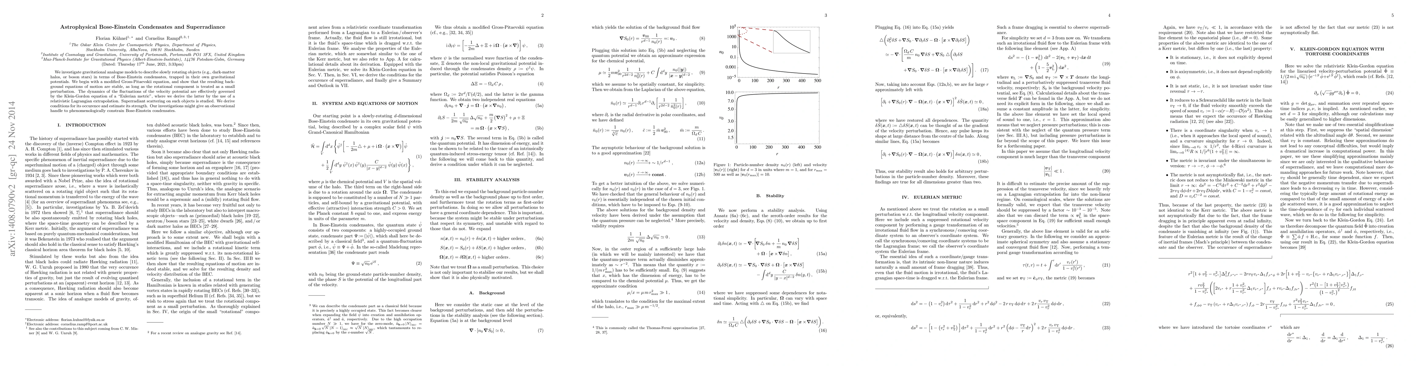 We investigate gravitational analogue models to describe slowly rotating objects (e.g., dark-matter halos, or boson stars) in terms of Bose-Einstein condensates, trapped in their own gravitational potentials. We begin with a modified Gross-Pitaevskii equation, and show that the resulting background equations of motion are stable, as long as the rotational component is treated as a small perturbation. The dynamics of the fluctuations of the velocity potential are effectively governed by the Klein-Gordon equation of a "Eulerian metric," where we derive the latter by the use of a relativistic Lagrangian extrapolation. Superradiant scattering on such objects is studied. We derive conditions for its occurence and estimate its strength. Our investigations might give an observational handle to phenomenologically constrain Bose-Einstein condensates.