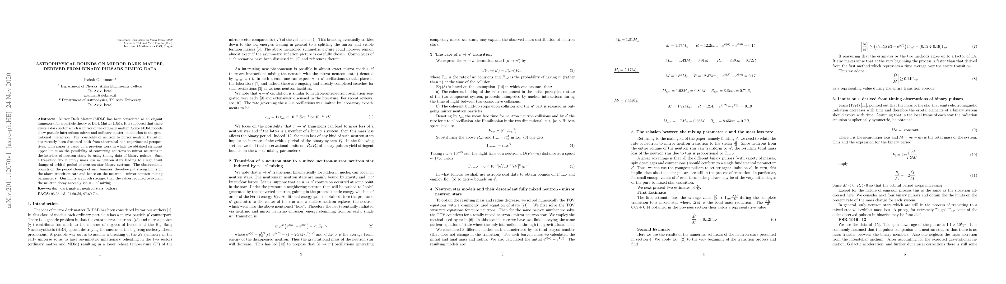 This paper sets strong limits on Mirror Dark Matter (MDM) particles, finding that a recent theory is ruled out due to the absence of significant changes in binary pulsar orbits.