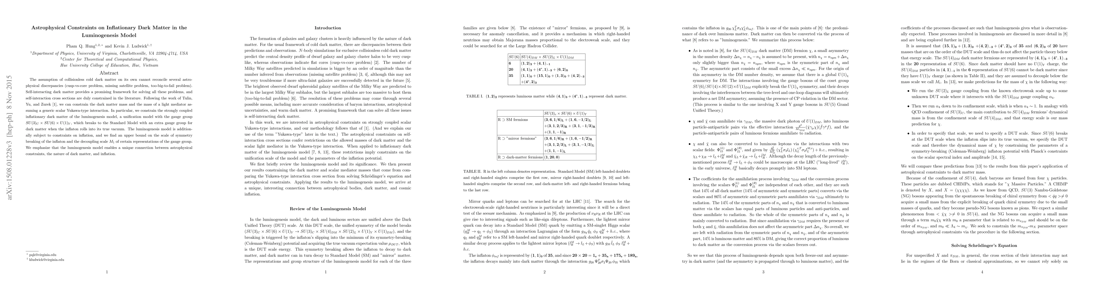 The assumption of collisionless cold dark matter on its own cannot reconcile several astrophysical discrepancies (cusp-vs-core problem, missing satellite problem, too-big-to-fail problem). Self-interacting dark matter provides a promising framework for solving all these problems, and self-interaction cross sections are duly constrained in the literature. Following the work of Tulin, Yu, and Zurek [1], we can constrain the dark matter mass and the mass of a light mediator assuming a generic scalar Yukawa-type interaction. In particular, we constrain the strongly coupled inflationary dark matter of the luminogenesis model, a unification model with the gauge group $SU(3)_C \times SU(6) \times U(1)_Y$, which breaks to the Standard Model with an extra gauge group for dark matter when the inflaton rolls into its true vacuum. The luminogenesis model is additionally subject to constraints on inflation, and we find an upper bound on the scale of symmetry breaking of the inflaton and the decoupling scale $M_1$ of certain representations of the gauge group. We emphasize that the luminogenesis model enables a unique connection between astrophysical constraints, the nature of dark matter, and inflation.