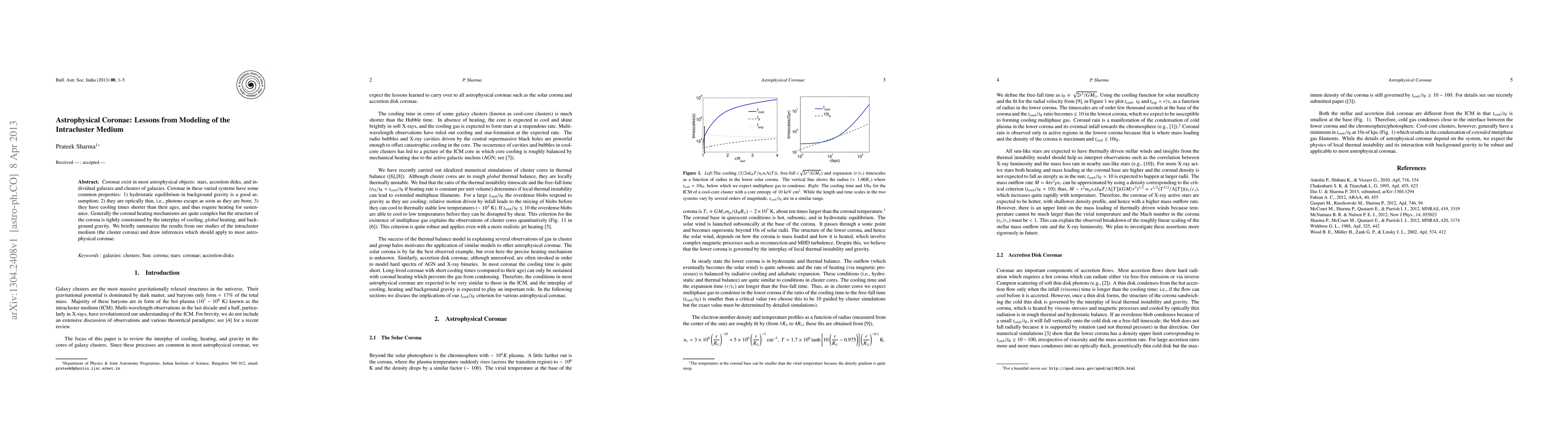 Coronae exist in most astrophysical objects: stars, accretion disks, and individual galaxies and clusters of galaxies. Coronae in these varied systems have some common properties: 1) hydrostatic equilibrium in background gravity is a good assumption; 2) they are optically thin, i.e., photons escape as soon as they are born; 3) they have cooling times shorter than their ages, and thus require heating for sustenance. Generally the coronal heating mechanisms are quite complex but the structure of the corona is tightly constrained by the interplay of cooling, {\em global} heating, and background gravity. We briefly summarize the results from our studies of the intracluster medium (the cluster corona) and draw inferences which should apply to most astrophysical coronae.