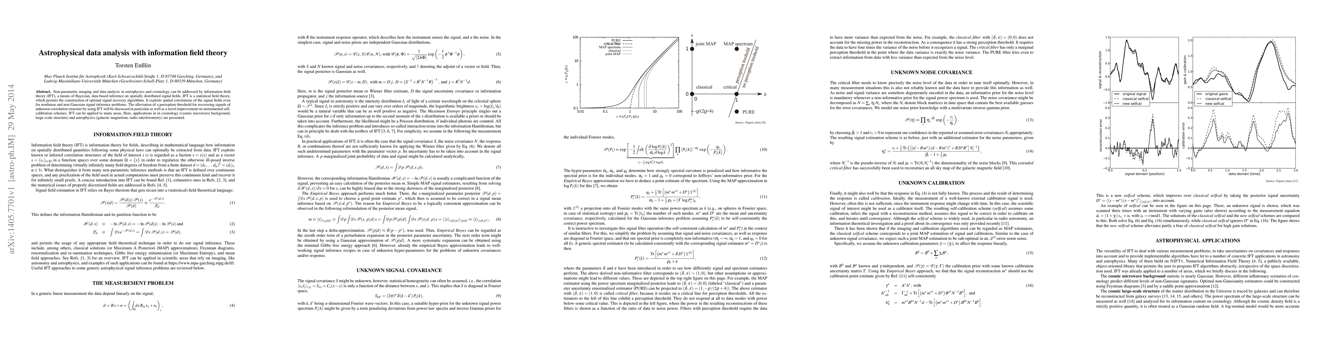This paper explores the application of information field theory (IFT) for non-parametric imaging and data analysis in astrophysics and cosmology, demonstrating its effectiveness in recovering signals with unknown correlation structures and improving self-calibration schemes. IFT's potential is showcased through its use in cosmology and astrophysics, including cosmic microwave background studies and galactic magnetism.