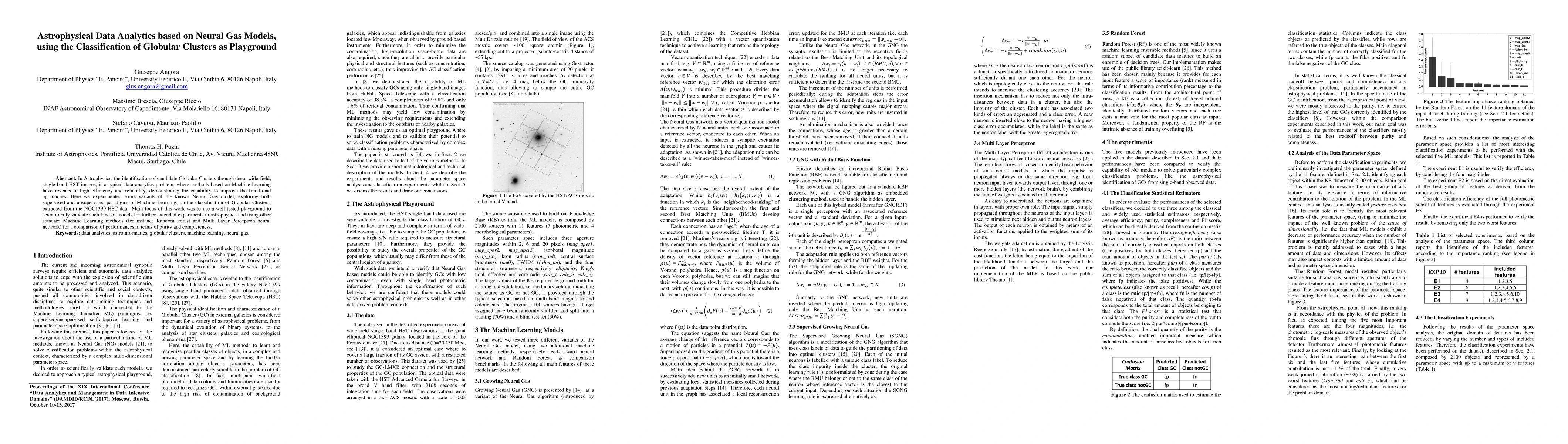 This paper explores astrophysical data analytics using Neural Gas models for classifying Globular Clusters from HST images. It compares supervised and unsupervised learning paradigms to validate the models' efficiency and reliability against traditional methods.