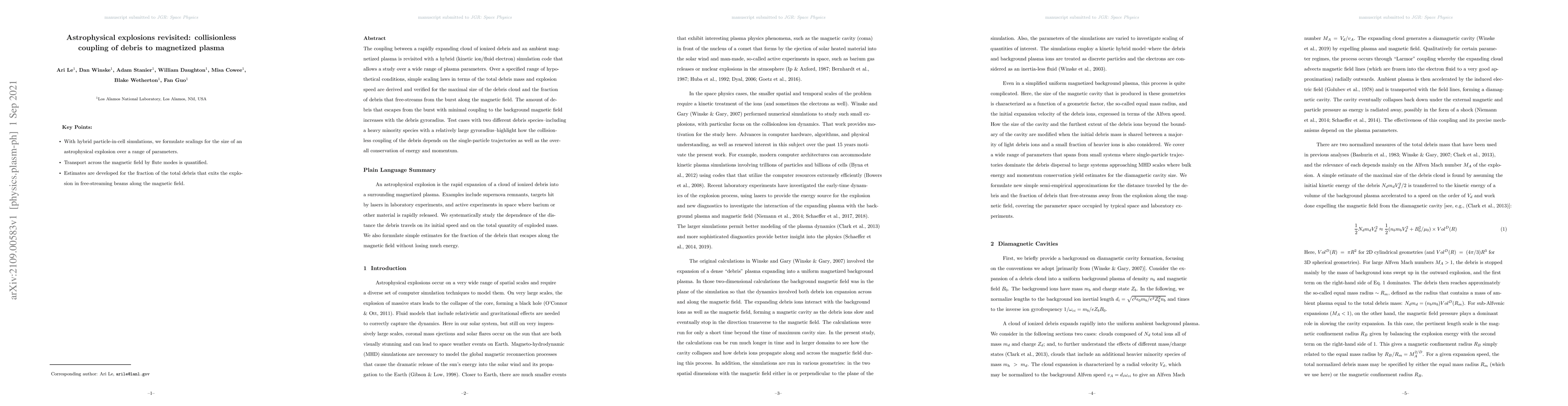 Researchers simulated collisionless coupling between debris and magnetized plasma to derive scaling laws for debris cloud size and escape fraction, highlighting how gyroradius affects debris escape from magnetic fields.
