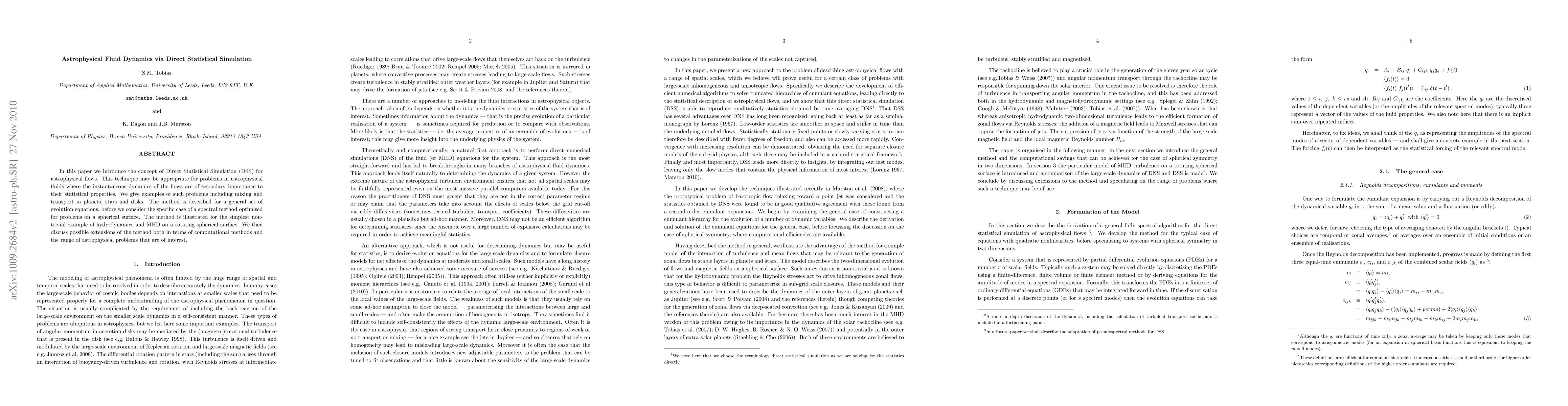 This paper introduces Direct Statistical Simulation (DSS) for analyzing astrophysical fluid dynamics, focusing on statistical properties rather than instantaneous dynamics. It demonstrates the method using hydrodynamics and magnetohydrodynamics on a rotating spherical surface, and discusses potential extensions for broader applications.