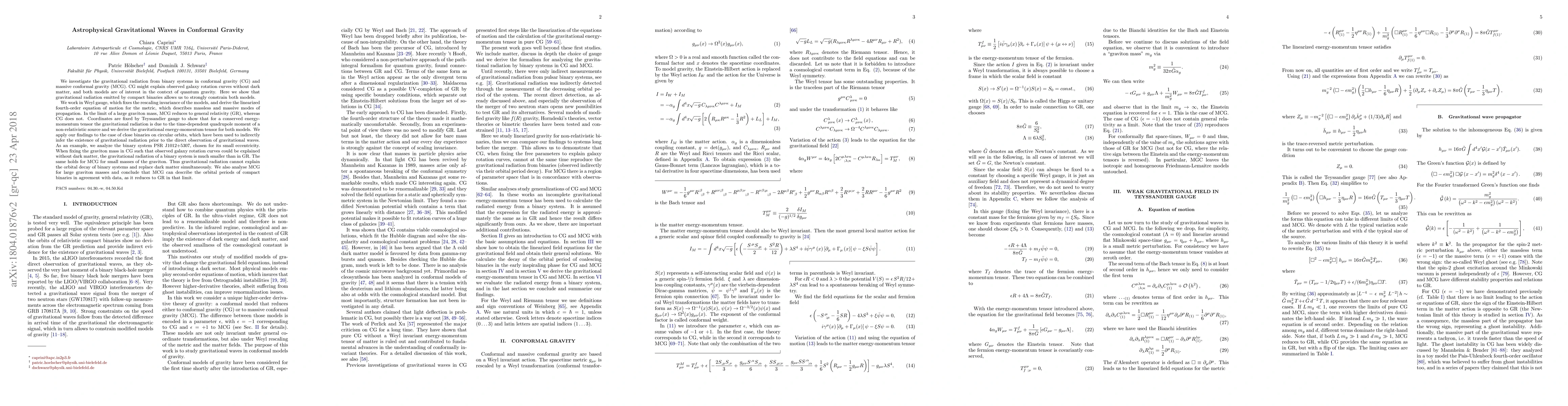 This paper investigates gravitational radiation from binary systems in conformal gravity (CG) and massive conformal gravity (MCG) to constrain these models. It finds that while MCG can describe binary systems like PSR J1012+5307, neither CG nor MCG can simultaneously explain galaxy rotation curves without dark matter and account for gravitational radiation from binaries.