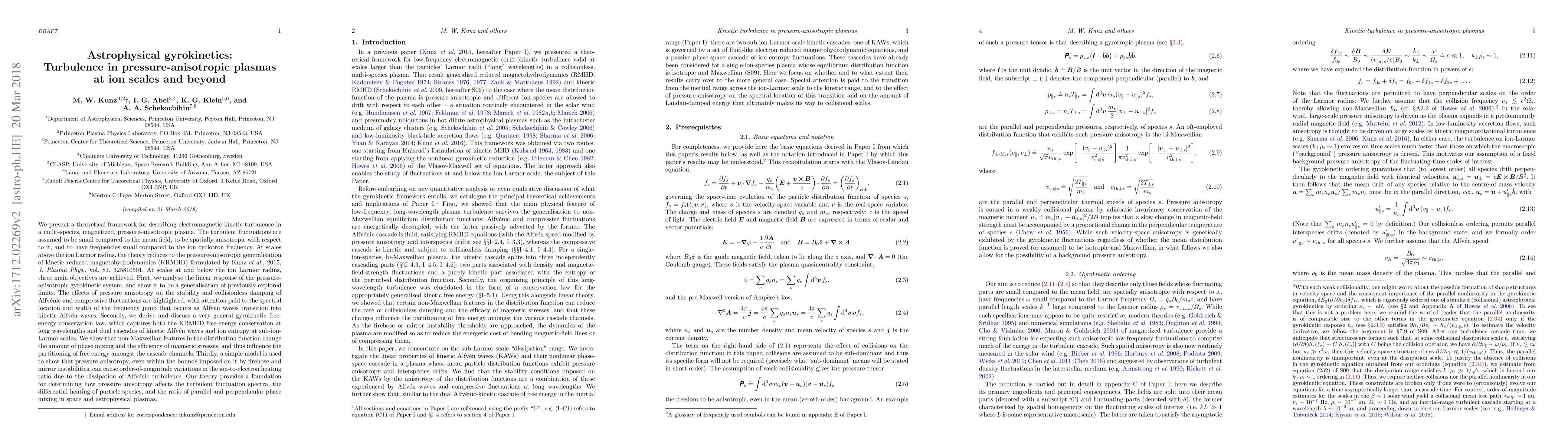 This paper develops a theoretical framework for electromagnetic kinetic turbulence in pressure-anisotropic plasmas, focusing on ion scales and beyond. It highlights the effects of pressure anisotropy on Alfvenic and compressive fluctuations, derives a free-energy conservation law, and shows how pressure anisotropy influences the heating of ion-to-electron ratios through Alfvenic turbulence dissipation.