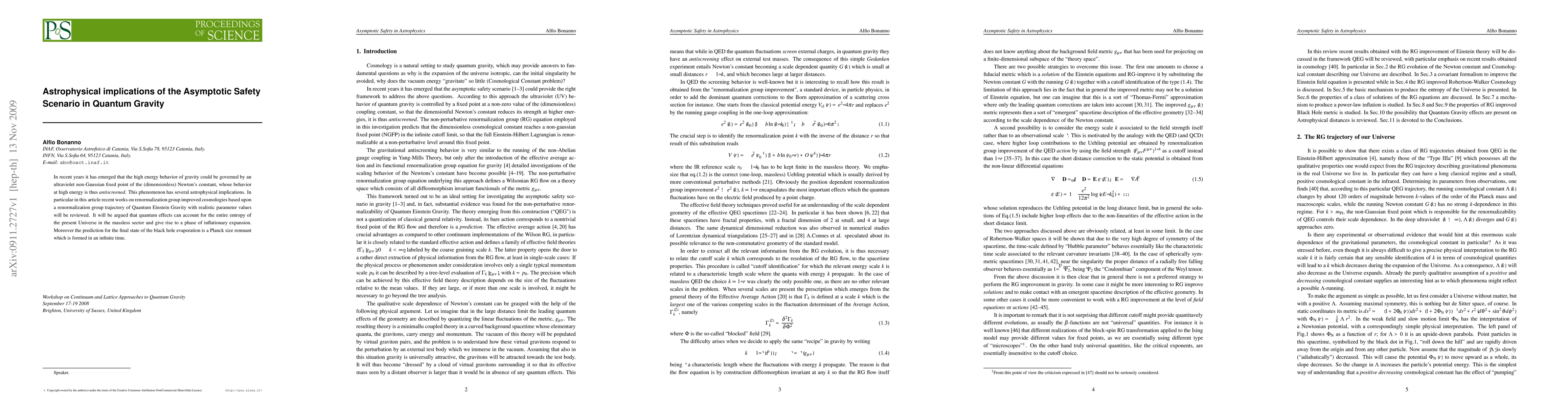 In recent years it has emerged that the high energy behavior of gravity could be governed by an ultraviolet non-Gaussian fixed point of the (dimensionless) Newton's constant, whose behavior at high energy is thus {\it antiscreened}. This phenomenon has several astrophysical implications. In particular in this article recent works on renormalization group improved cosmologies based upon a renormalization group trajectory of Quantum Einstein Gravity with realistic parameter values will be reviewed. It will be argued that quantum effects can account for the entire entropy of the present Universe in the massless sector and give rise to a phase of inflationary expansion. Moreover the prediction for the final state of the black hole evaporation is a Planck size remnant which is formed in an infinite time.