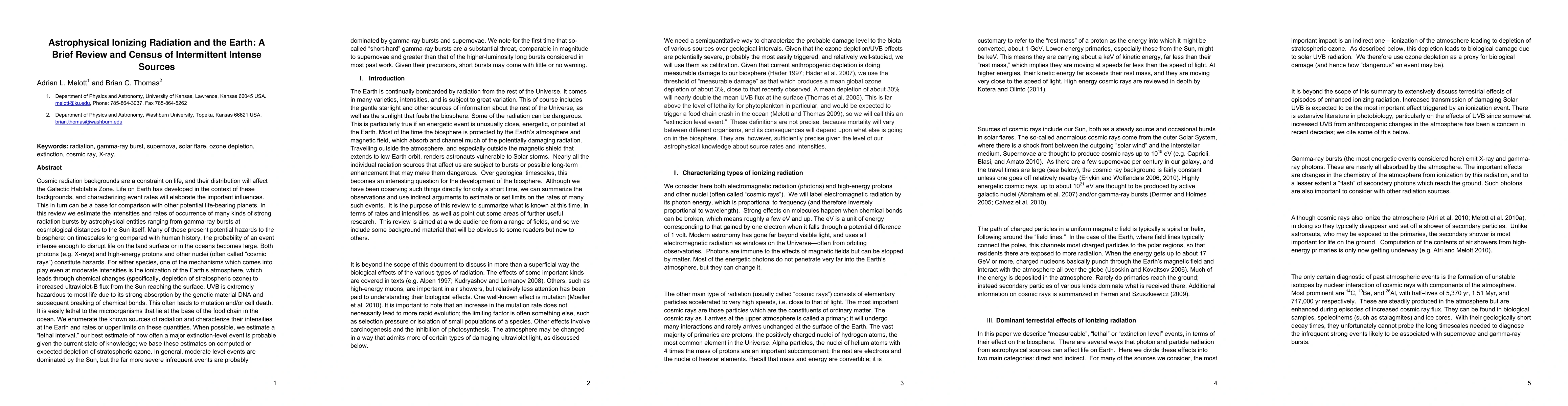 Cosmic radiation backgrounds are a constraint on life, and their distribution will affect the Galactic Habitable Zone. Life on Earth has developed in the context of these backgrounds, and characterizing event rates will elaborate the important influences. This in turn can be a base for comparison with other potential life-bearing planets. In this review we estimate the intensities and rates of occurrence of many kinds of strong radiation bursts by astrophysical entities ranging from gamma-ray bursts at cosmological distances to the Sun itself. Many of these present potential hazards to the biosphere: on timescales long compared with human history, the probability of an event intense enough to disrupt life on the land surface or in the oceans becomes large. We enumerate the known sources of radiation and characterize their intensities at the Earth and rates or upper limits on these quantities. When possible, we estimate a "lethal interval", our best estimate of how often a major extinction-level event is probable given the current state of knowledge; we base these estimates on computed or expected depletion of stratospheric ozone. In general, moderate level events are dominated by the Sun, but the far more severe infrequent events are probably dominated by gamma-ray bursts and supernovae. We note for the first time that so-called "short-hard" gamma-ray bursts are a substantial threat, comparable in magnitude to supernovae and greater than that of the higher-luminosity long bursts considered in most past work. Given their precursors, short bursts may come with little or no warning.