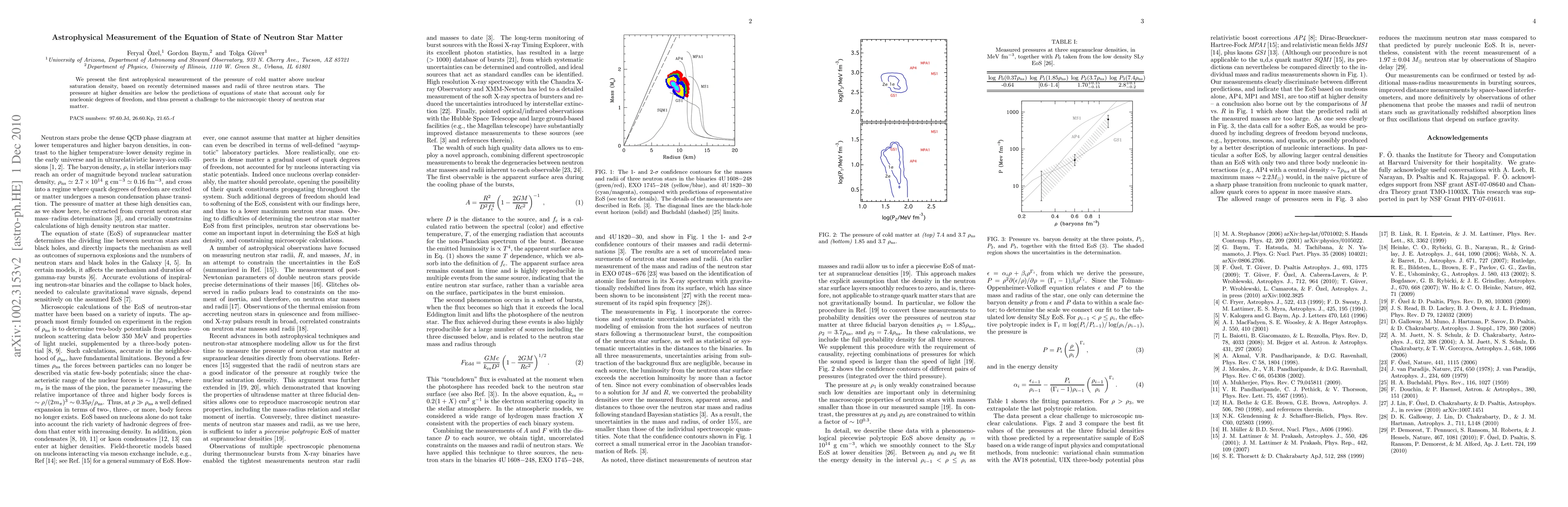 We present the first astrophysical measurement of the pressure of cold matter above nuclear saturation density, based on recently determined masses and radii of three neutron stars. The pressure at higher densities are below the predictions of equations of state that account only for nucleonic degrees of freedom, and thus present a challenge to the microscopic theory of neutron star matter.