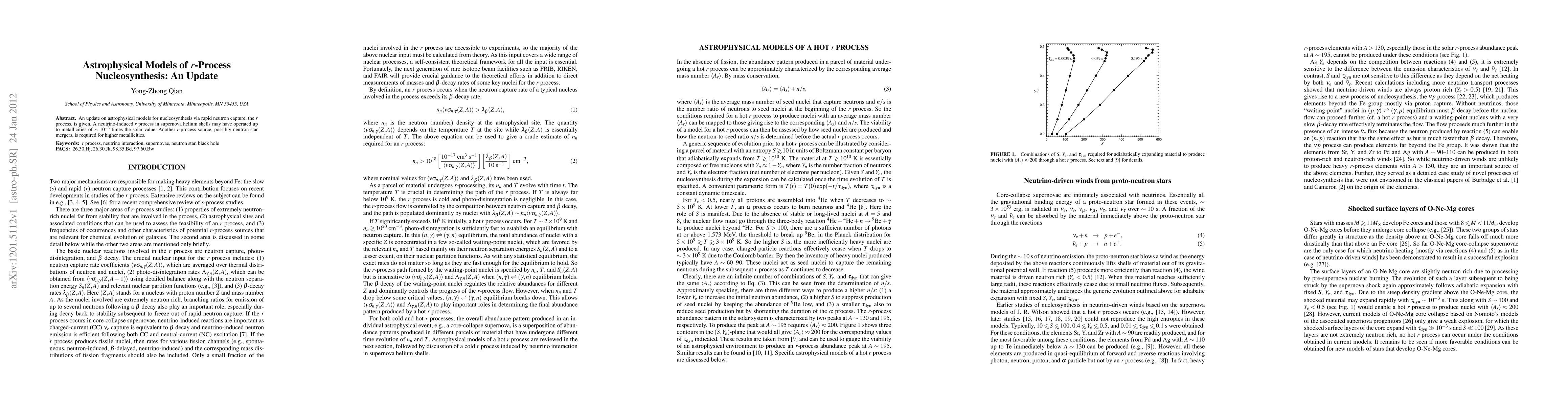 An update on astrophysical models for nucleosynthesis via rapid neutron capture, the r process, is given. A neutrino-induced r process in supernova helium shells may have operated up to metallicities of ~10^-3 times the solar value. Another r-process source, possibly neutron star mergers, is required for higher metallicities.