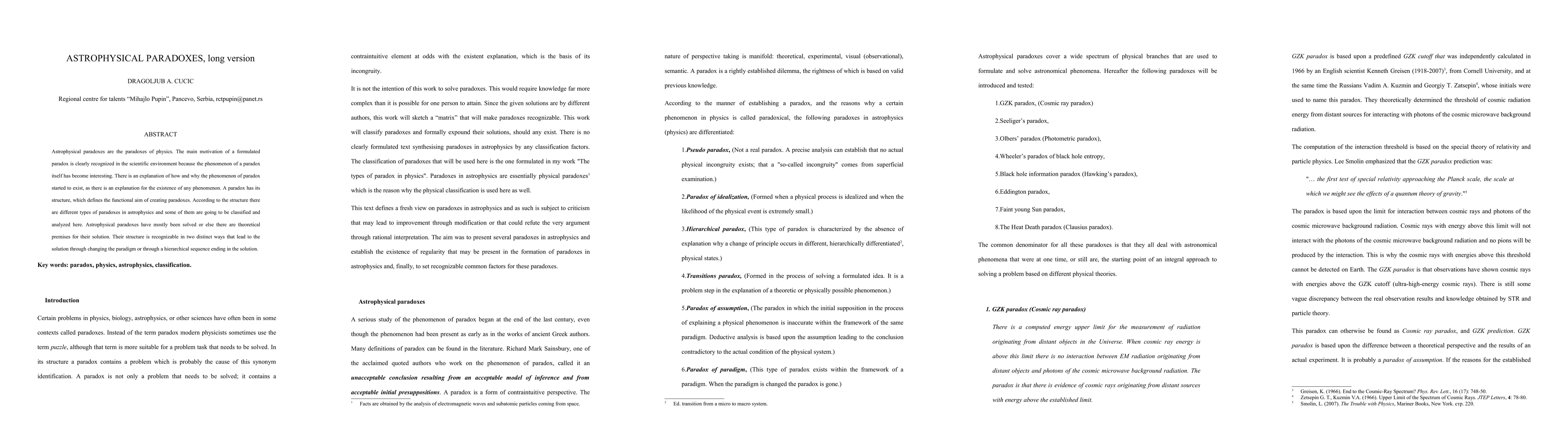 Astrophysical paradoxes are the paradoxes of physics. The main motivation of a formulated paradox is clearly recognized in the scientific environment because the phenomenon of a paradox itself has become interesting. There is an explanation of how and why the phenomenon of paradox started to exist, as there is an explanation for the existence of any phenomenon. A paradox has its structure, which defines the functional aim of creating paradoxes. According to the structure there are different types of paradoxes in astrophysics and some of them are going to be classified and analyzed here. Astrophysical paradoxes have mostly been solved or else there are theoretical premises for their solution. Their structure is recognizable in two distinct ways that lead to the solution through changing the paradigm or through a hierarchical sequence ending in the solution.