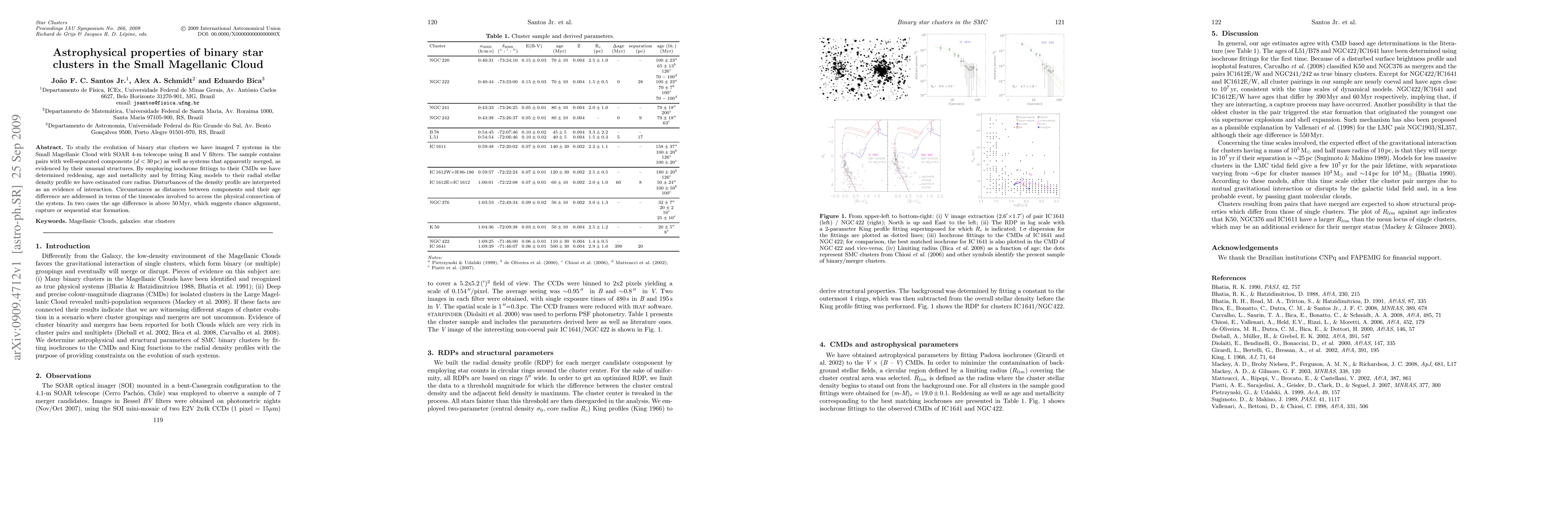 To study the evolution of binary star clusters we have imaged 7 systems in the Small Magellanic Cloud with SOAR 4-m telescope using B and V filters. The sample contains pairs with well-separated components (d < 30 pc) as well as systems that apparently merged, as evidenced by their unusual structures. By employing isochrone fittings to their CMDs we have determined reddening, age and metallicity and by fitting King models to their radial stellar density profile we have estimated core radius. Disturbances of the density profile are interpreted as an evidence of interaction. Circunstances as distances between components and their age difference are addressed in terms of the timescales involved to access the physical connection of the system. In two cases the age difference is above 50 Myr, which suggests chance alignment, capture or sequential star formation.