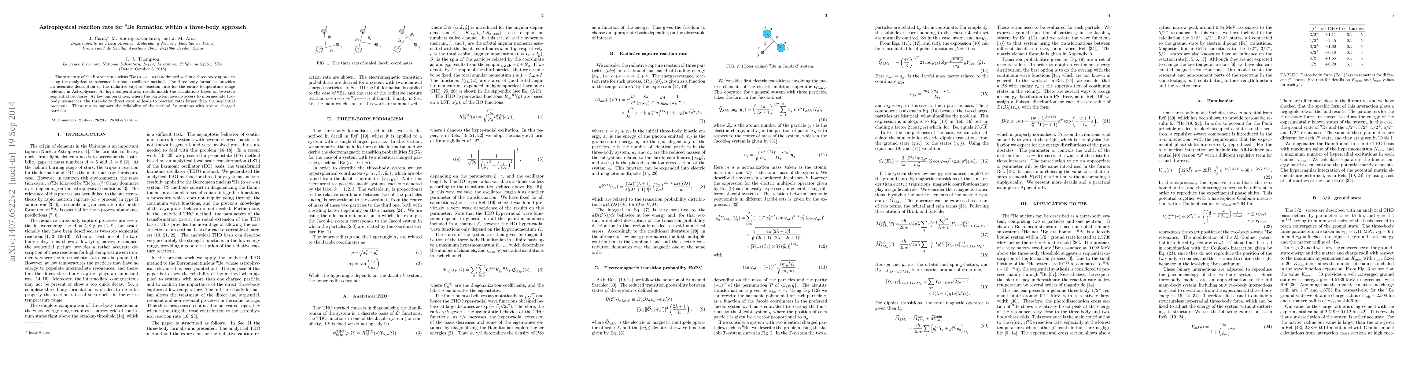 The structure of the Borromean nucleus $^9$Be ($\alpha+\alpha+n$) is addressed within a three-body approach using the analytical transformed harmonic oscillator method. The three-body formalism provides an accurate description of the radiative capture reaction rate for the entire temperature range relevant in Astrophysics. At high temperatures, results match the calculations based on two-step sequential processes. At low temperatures, where the particles have no access to intermediate two-body resonances, the three-body direct capture leads to reaction rates larger than the sequential processes. These results support the reliability of the method for systems with several charged particles.