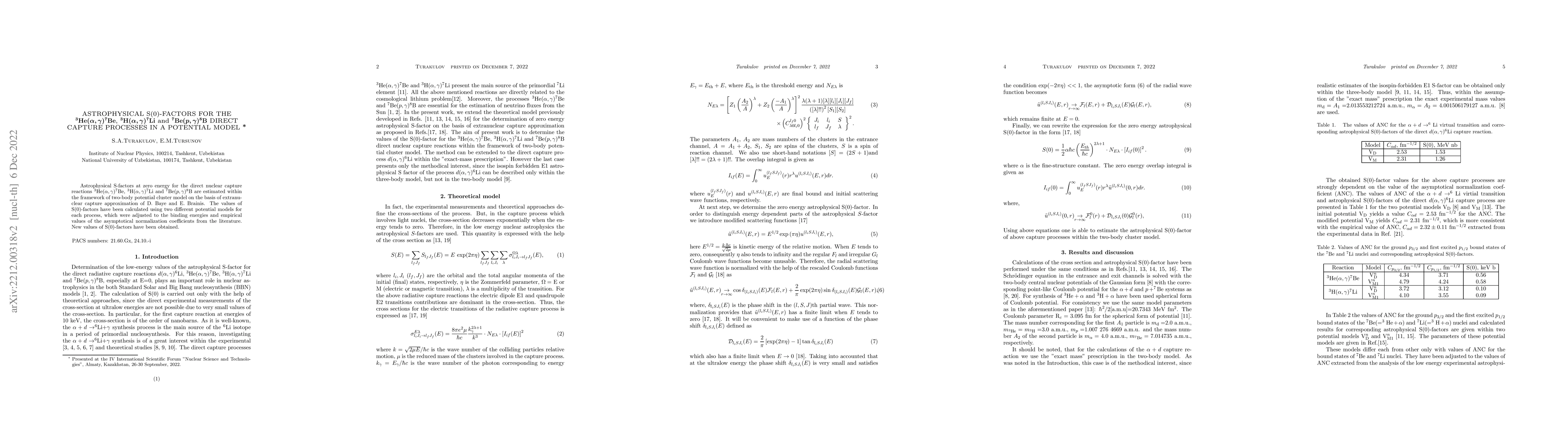 This paper estimates astrophysical S(0)-factors for three direct nuclear capture reactions using a two-body potential cluster model, obtaining new values by adjusting potential models to binding energies and empirical data. The reactions studied are $^{3}{\rm He}(\alpha, \gamma)^{7}{\rm Be}$, $^{3}{\rm H}(\alpha, \gamma)^{7}{\rm Li}$, and $^{7}{\rm Be}(p, \gamma)^{8}{\rm B}$.