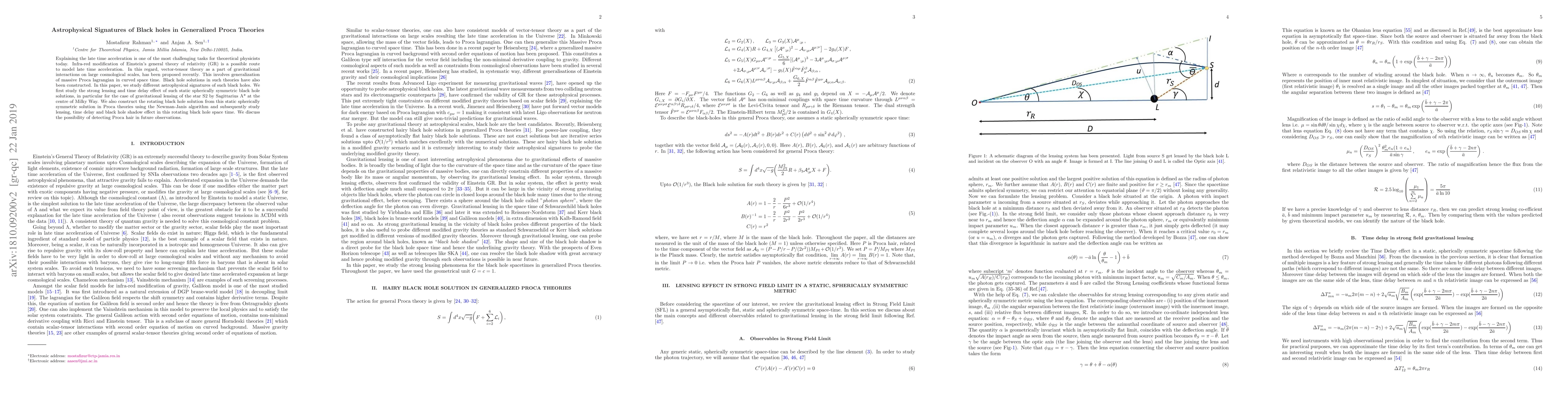 Explaining the late time acceleration is one of the most challenging tasks for theoretical physicists today. Infra-red modification of Einstein's general theory of relativity (GR) is a possible route to model late time acceleration. In this regard, vector-tensor theory as a part of gravitational interactions on large cosmological scales, has been proposed recently. This involves generalization of massive Proca lagrangian in curved space time. Black hole solutions in such theories have also been constructed. In this paper, we study different astrophysical signatures of such black holes. We first study the strong lensing and time delay effect of such static spherically symmetric black hole solutions, in particular for the case of gravitational lensing of the star S2 by Sagittarius A* at the centre of Milky Way. We also construct the rotating black hole solution from this static spherically symmetric solution in Proca theories using the Newman-Janis algorithm and subsequently study lensing, time delay and black hole shadow effect in this rotating black hole space time. We discuss the possibility of detecting Proca hair in future observations.