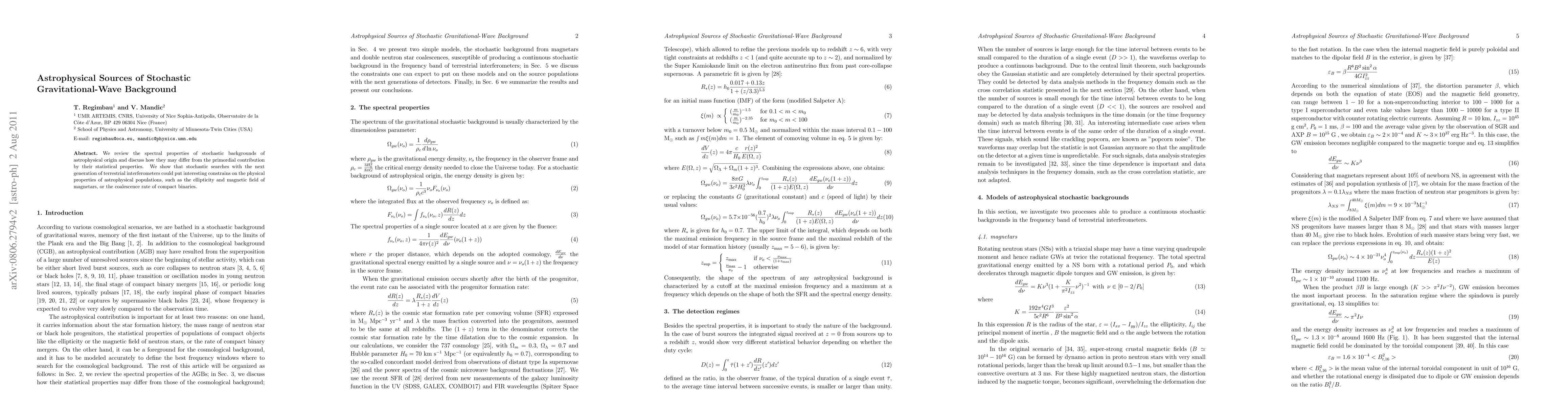We review the spectral properties of stochastic backgrounds of astrophysical origin and discuss how they may differ from the primordial contribution by their statistical properties. We show that stochastic searches with the next generation of terrestrial interferometers could put interesting constrains on the physical properties of astrophysical populations, such as the ellipticity and magnetic field of magnetars, or the coalescence rate of compact binaries.