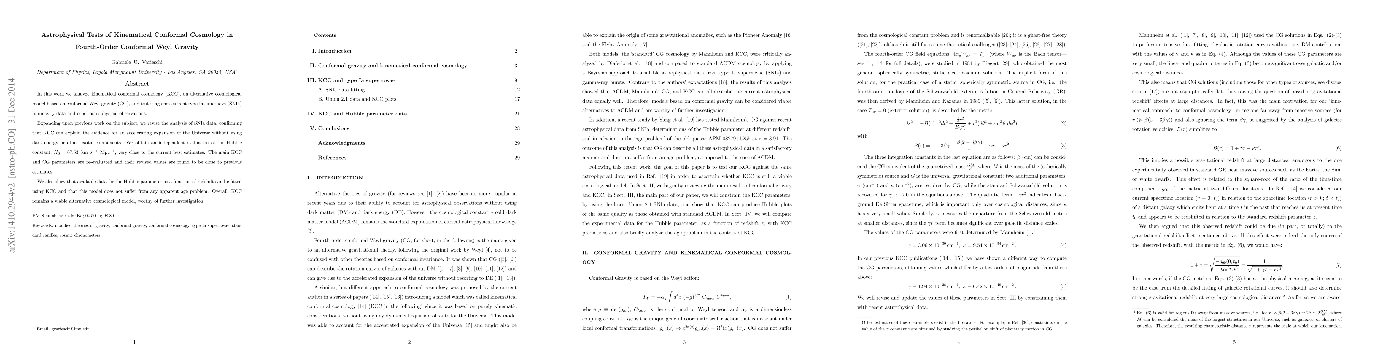 This paper tests kinematical conformal cosmology (KCC) based on conformal Weyl gravity against astrophysical data, confirming it can explain cosmic acceleration without dark energy. The revised analysis yields a Hubble constant close to current estimates, supporting KCC as a viable alternative cosmological model.