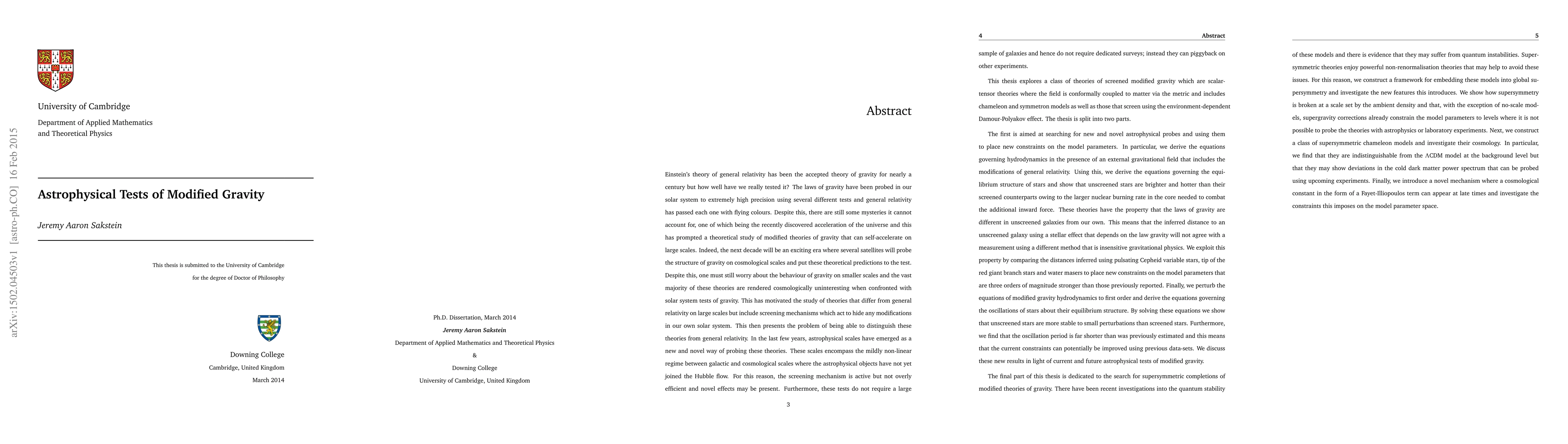 Chameleon and similar (symmetron and dilation) theories of gravity can exhibit new and interesting features on cosmological scales whilst screening the modifications on small scales thereby satisfying solar system tests of general relativity. This thesis explores the regime between these two scales: astrophysics. The majority of this thesis is focused on discerning new and novel astrophysical probes of chameleon gravity in the form of stellar structure and oscillation tests. These are used to place new constraints on the theory parameters and the implications of these are discussed, as are the future prospects for improving them using planned future surveys. The final two chapters review supersymmetric completions of these theories.