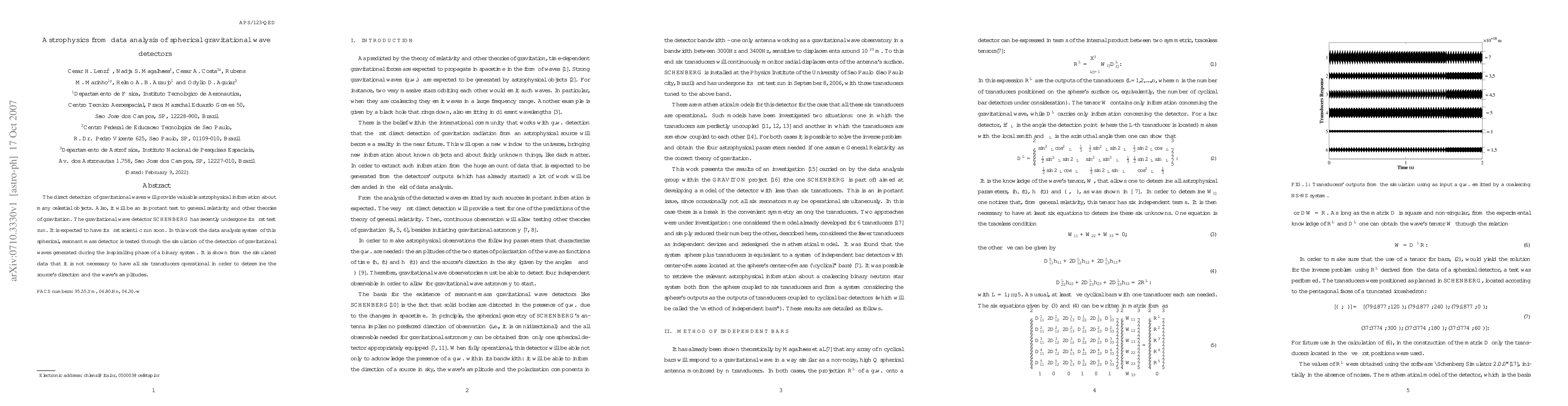 The direct detection of gravitational waves will provide valuable astrophysical information about many celestial objects. Also, it will be an important test to general relativity and other theories of gravitation. The gravitational wave detector SCHENBERG has recently undergone its first test run. It is expected to have its first scientific run soon. In this work the data analysis system of this spherical, resonant mass detector is tested through the simulation of the detection of gravitational waves generated during the inspiralling phase of a binary system. It is shown from the simulated data that it is not necessary to have all six transducers operational in order to determine the source's direction and the wave's amplitudes.