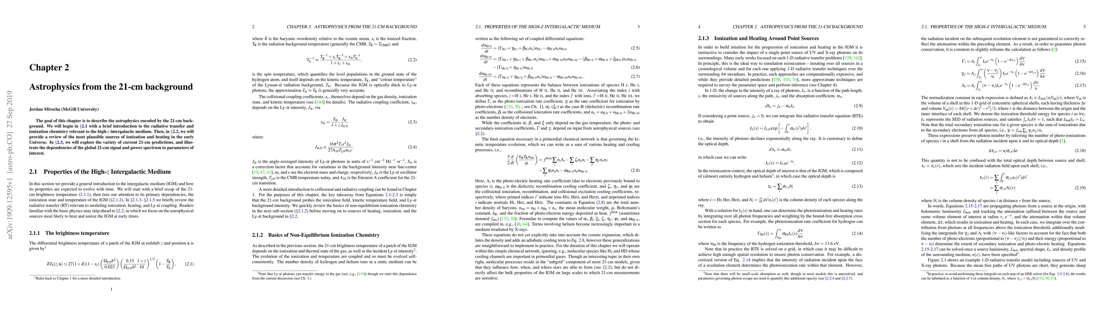 This paper explores the astrophysics of the 21-cm background, detailing the radiative transfer and ionization chemistry of the high-z intergalactic medium, and reviews potential early Universe ionization and heating sources. It also examines current 21-cm predictions and their sensitivity to key parameters.