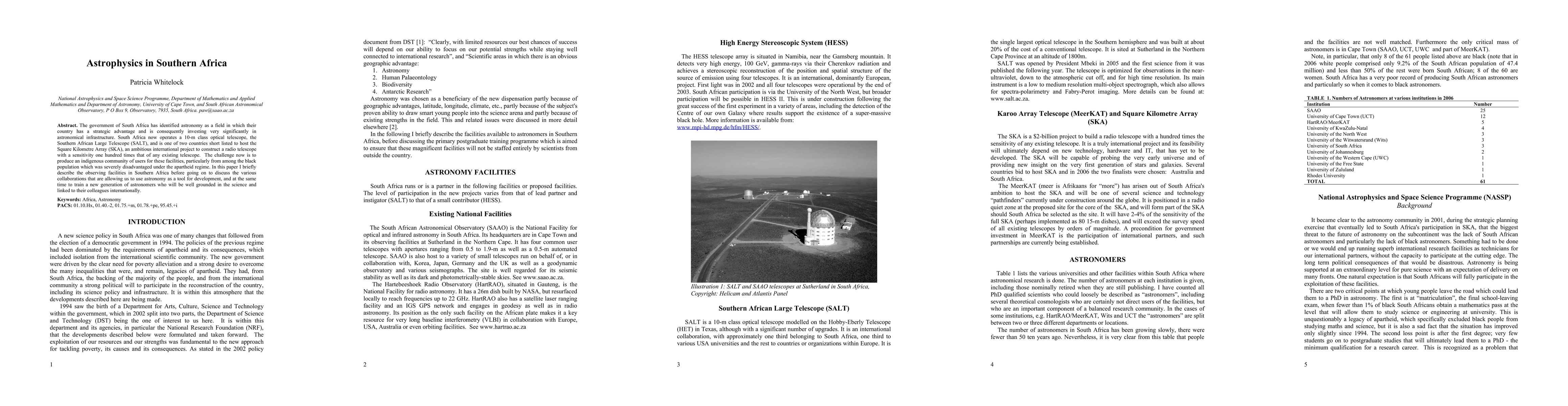 South Africa is investing heavily in astronomical infrastructure to promote development and training of astronomers from underrepresented communities. The country operates a 10-m class optical telescope and is a shortlisted candidate for the Square Kilometre Array project.