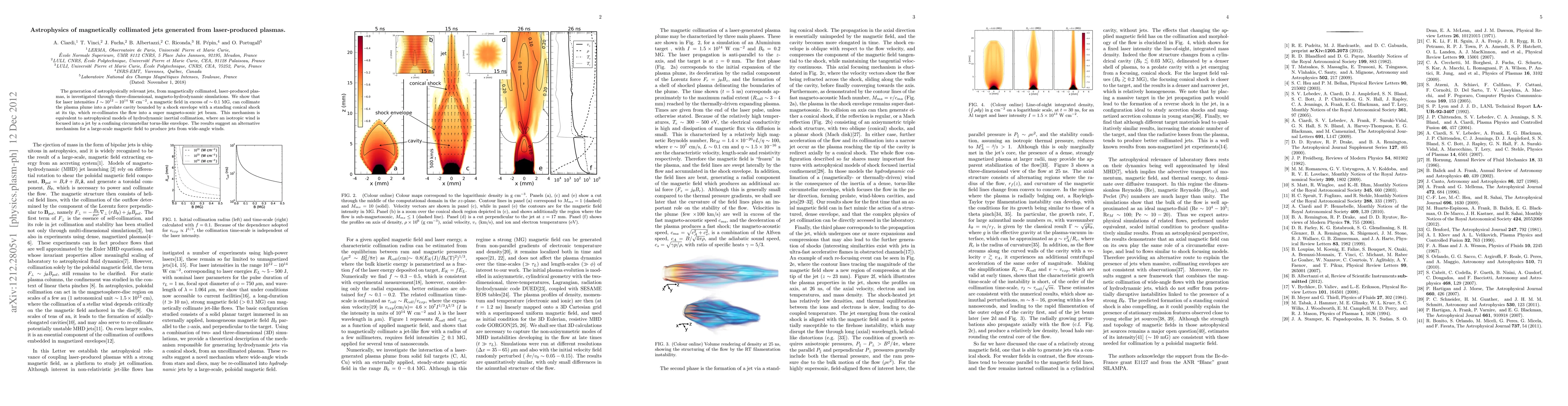 This paper investigates the generation of astrophysical jets from magnetically collimated laser-produced plasmas using 3D magneto-hydrodynamic simulations. It finds that high laser intensities and strong magnetic fields can transform wide-angle plasma plumes into focused, supersonic jets, akin to models of hydrodynamic inertial collimation.