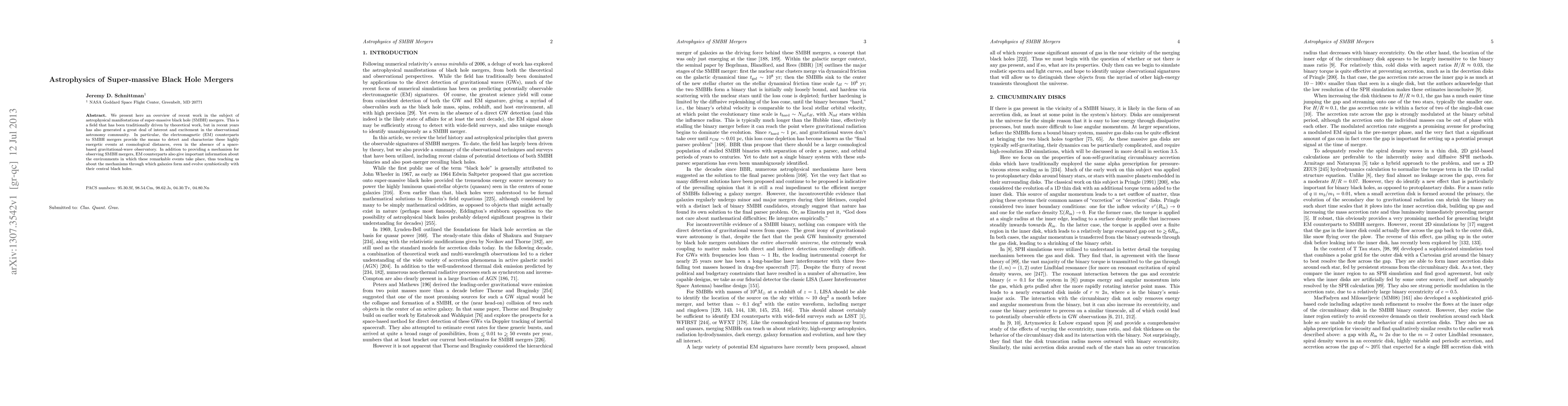 We present here an overview of recent work in the subject of astrophysical manifestations of super-massive black hole (SMBH) mergers. This is a field that has been traditionally driven by theoretical work, but in recent years has also generated a great deal of interest and excitement in the observational astronomy community. In particular, the electromagnetic (EM) counterparts to SMBH mergers provide the means to detect and characterize these highly energetic events at cosmological distances, even in the absence of a space-based gravitational-wave observatory. In addition to providing a mechanism for observing SMBH mergers, EM counterparts also give important information about the environments in which these remarkable events take place, thus teaching us about the mechanisms through which galaxies form and evolve symbiotically with their central black holes.