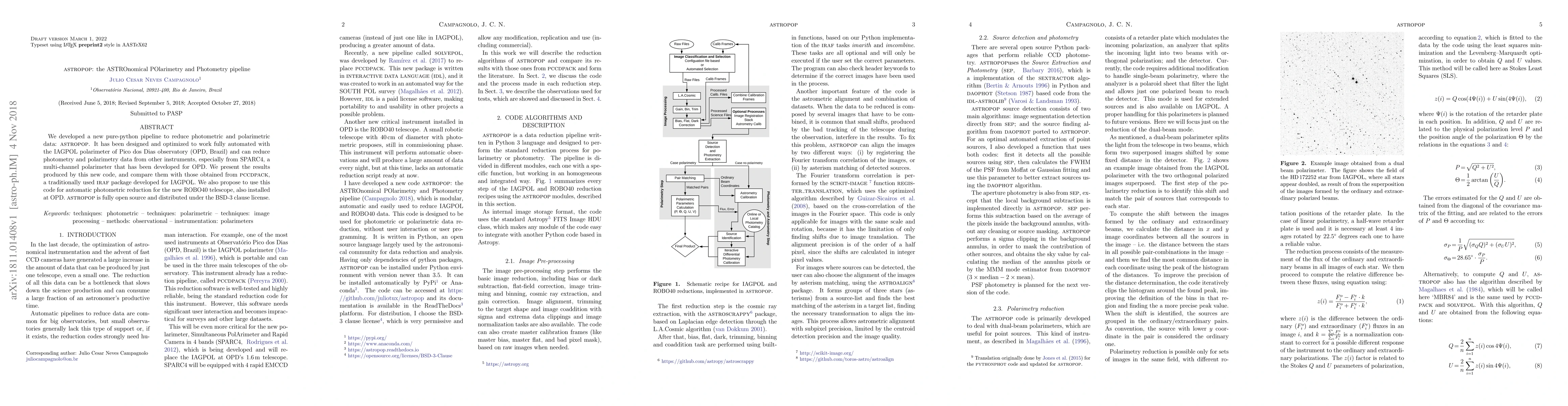 I developed a new pure-python pipeline to reduce photometric and polarimetric data: ASTROPOP. It has been designed and optimized to work fully automated with the IAGPOL polarimeter of Pico dos Dias observatory (OPD, Brazil) and can reduce photometry and polarimetry data from other instruments, especially from SPARC4, a multi-channel polarimeter that has been developed for OPD. We present the results produced by this new code, and compare them with those obtained from PCCDPACK, a traditionally used IRAF package developed for IAGPOL. We also propose to use this code for automatic photometric reduction for the new ROBO40 telescope, also installed at OPD. ASTROPOP is fully open source and distributed under the BSD-3 clause license.