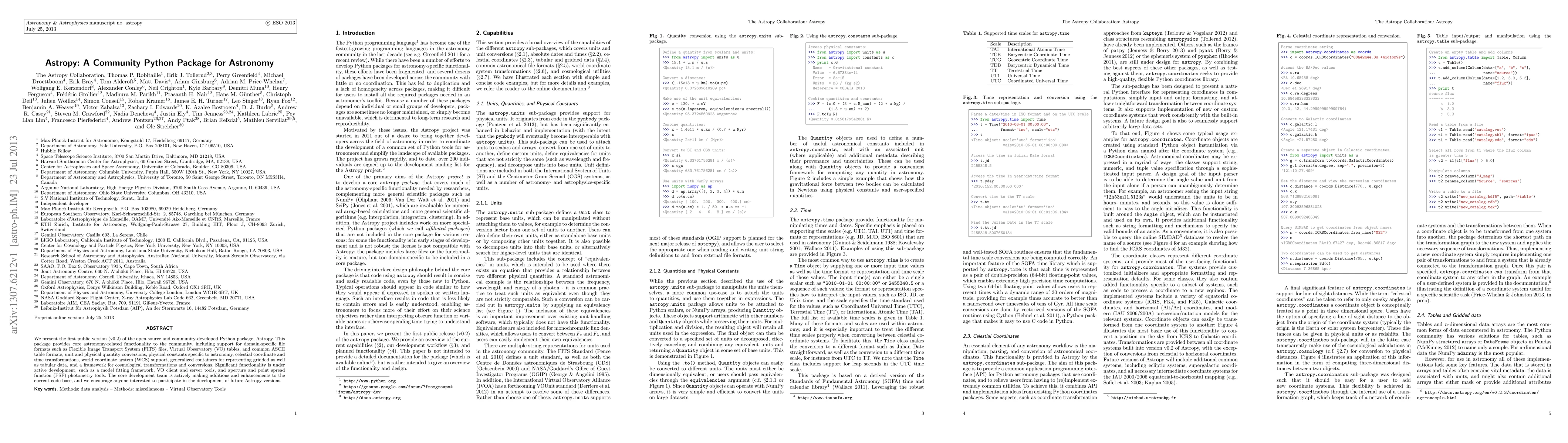Astropy is a community-driven Python package offering core astronomy functionalities, including support for FITS files, VO tables, and unit conversions, with ongoing development for advanced features like model fitting and PSF photometry. The project encourages community participation for future enhancements.