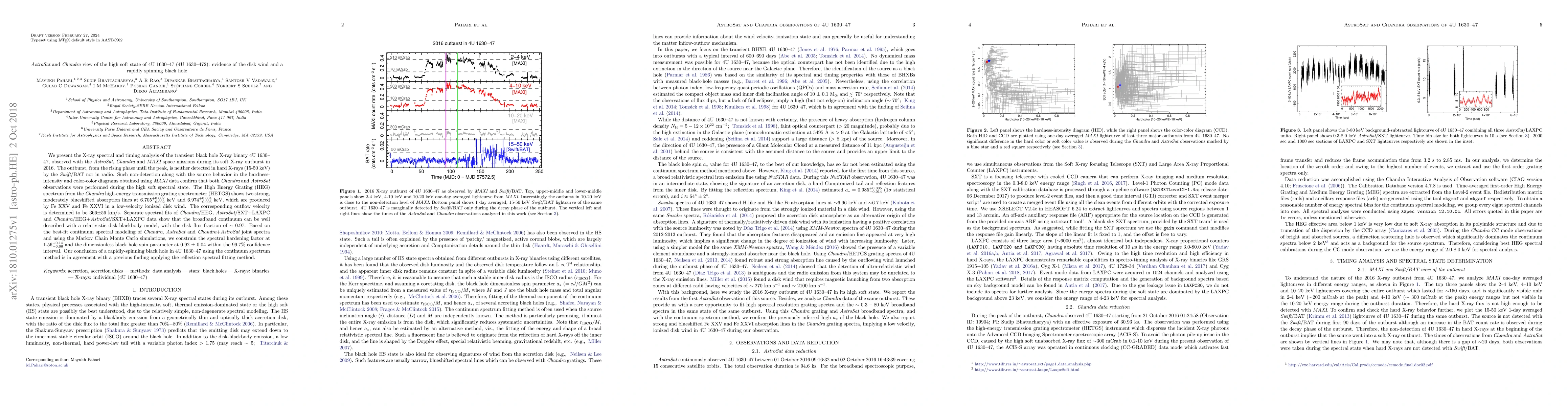 This paper analyzes the X-ray spectral and timing data from the black hole X-ray binary 4U 1630-47 during its 2016 soft X-ray outburst, revealing the presence of a rapidly spinning black hole and a low-velocity ionized disk wind. The study uses observations from AstroSat, Chandra, and MAXI, confirming the high soft state and determining a black hole spin parameter of 0.92 ± 0.04.