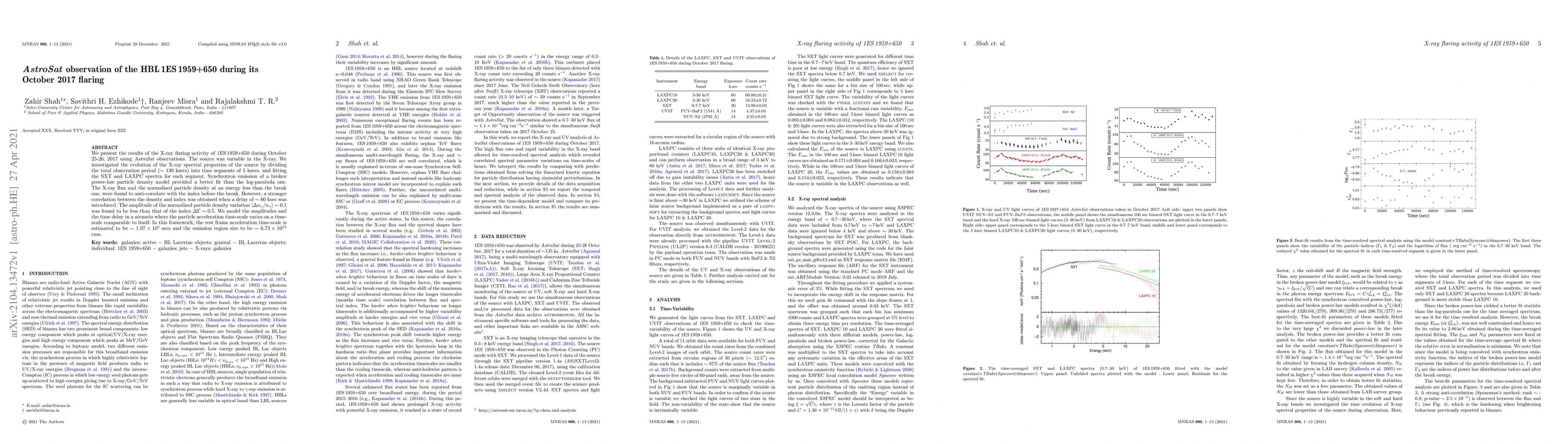 We present the results of the X-ray flaring activity of 1ES 1959+650 during October 25-26, 2017 using AstroSat observations. The source was variable in the X-ray. We investigated the evolution of the X-ray spectral properties of the source by dividing the total observation period ($\sim 130$ ksecs) into time segments of 5 ksecs, and fitting the SXT and LAXPC spectra for each segment. Synchrotron emission of a broken power-law particle density model provided a better fit than the log-parabola one. The X-ray flux and the normalised particle density at an energy less than the break one, were found to anti-correlate with the index before the break. However, a stronger correlation between the density and index was obtained when a delay of $\sim 60$ ksec was introduced. The amplitude of the normalised particle density variation $|\Delta n_\gamma/n_\gamma| \sim 0.1$ was found to be less than that of the index $\Delta \Gamma \sim 0.5$. We model the amplitudes and the time delay in a scenario where the particle acceleration time-scale varies on a time-scale comparable to itself. In this framework, the rest frame acceleration time-scale is estimated to be $\sim 1.97\times10^{5}$ secs and the emission region size to be $\sim 6.73\times 10^{15}$ cms.