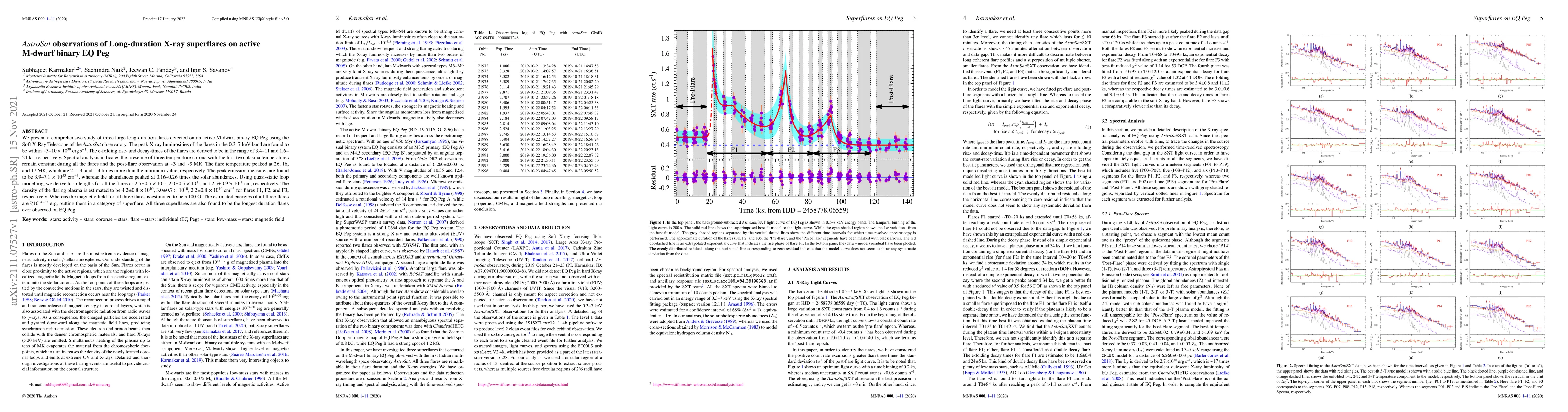 We present a comprehensive study of three large long-duration flares detected on an active M-dwarf binary EQ Peg using the Soft X-Ray Telescope of the AstroSat observatory. The peak X-ray luminosities of the flares in the 0.3 - 7 keV band are found to be within ~5 - 10 x 10^{30} erg s^{-1}. The e-folding rise- and decay-times of the flares are derived to be in the range of 3.4 - 11 and 1.6 - 24 ks, respectively. Spectral analysis indicates the presence of three temperature corona with the first two plasma temperatures remain constant during all the flares and the post-flare observation at ~3 and ~9 MK. The flare temperature peaked at 26, 16, and 17 MK, which are 2, 1.3, and 1.4 times more than the minimum value, respectively. The peak emission measures are found to be 3.9 - 7.1 x 10^{53} cm^{-3}, whereas the abundances peaked at 0.16-0.26 times the solar abundances. Using quasi-static loop modeling, we derive loop-lengths for all the flares as 2.5+/-0.5 x 10^{11}, 2.0+/-0.5 x 10^{11}, and 2.5+/-0.9 x 10^{11} cm, respectively. The density of the flaring plasma is estimated to be 4.2+/-0.8 x 10^{10}, 3.0+/-0.7 x 10^{10}, 2.2+/-0.8 x 10^{10} cm^{-3) for flares F1, F2, and F3, respectively. Whereas the magnetic field for all three flares is estimated to be <100 G. The estimated energies of all three flares are ~10^{34-35} erg, putting them in a category of superflare. All three superflares are also found to be the longest duration flares ever observed on EQ Peg.