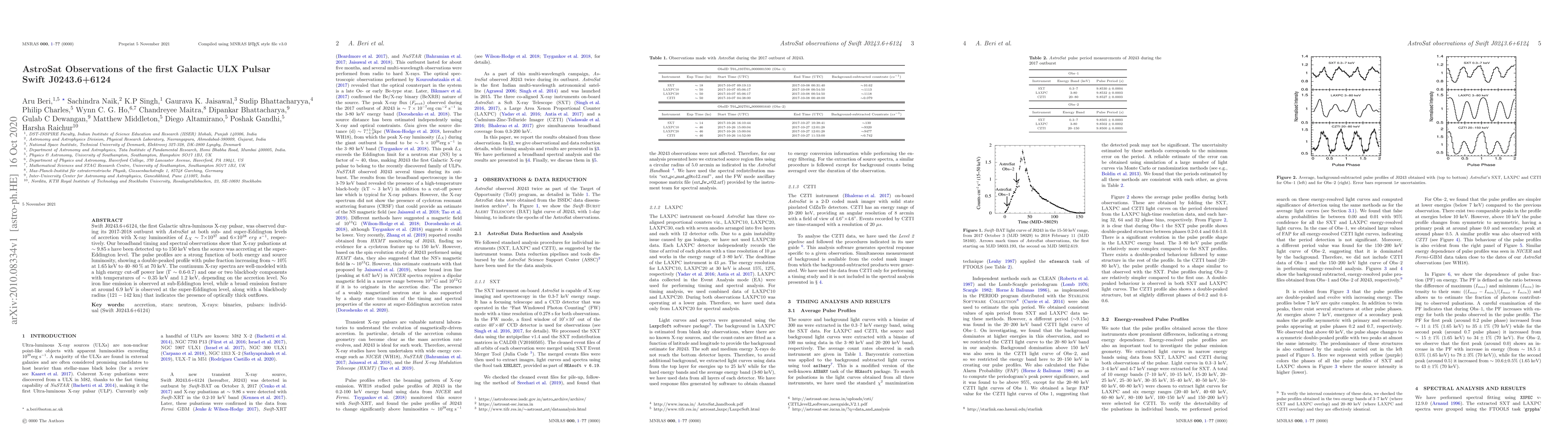 The research paper details AstroSat observations of SwiftJ0243.6+6124, the first Galactic ultra-luminous X-ray pulsar. Key findings include detection of X-ray pulsations up to 150keV at super-Eddington accretion levels, with pulse profiles and spectra varying significantly with energy and luminosity. The study reveals no iron line emission at sub-Eddington levels, but a broad feature at 6.9keV at super-Eddington levels, alongside evidence for optically thick outflows.