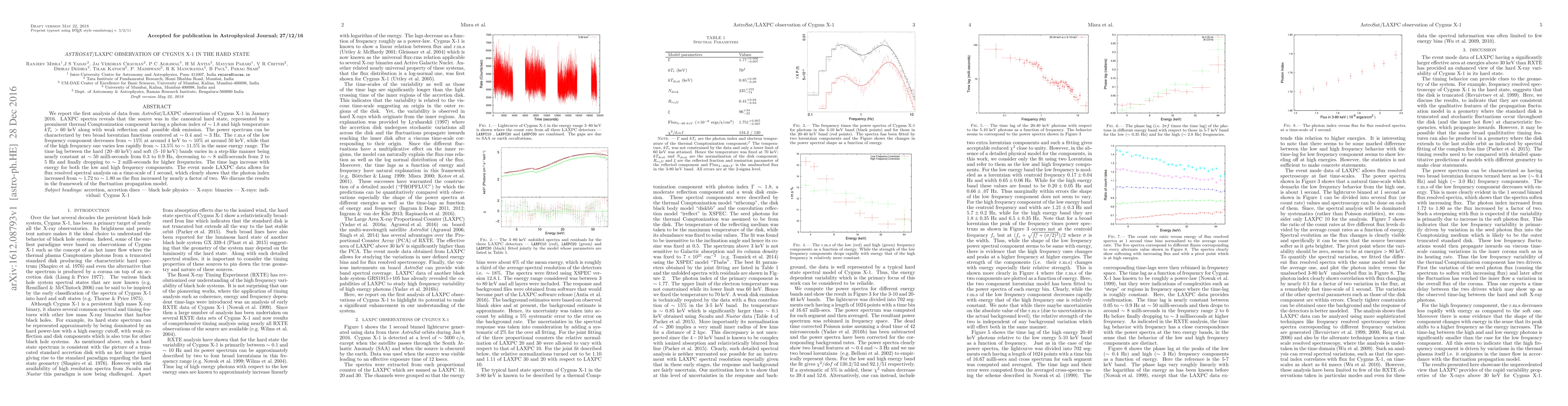 We report the first analysis of data from AstroSat/LAXPC observations of Cygnus X-1 in January 2016. LAXPC spectra reveals that the source was in the canonical hard state, represented by a prominent thermal Comptonization component having a photon index of 1.8 and high temperature kT of electron > 60 keV along with weak reflection and possible disk emission. The power spectrum can be characterized by two broad lorentzian functions centered at 0.4 and 3 Hz. The r.m.s of the low frequency component decreases from 15% at around 4 keV to 10% at around 50 keV, while that of the high frequency one varies less rapidly from 13.5% to 11.5% in the same energy range. The time lag between the hard (20 to 40 keV) and soft (5 to 10 keV) bands varies in a step-like manner being nearly constant at 50 Milli-seconds from 0.3 to 0.9 Hz, decreasing to 8 Milli-seconds from 2 to 5 Hz and finally dropping to 2 Milli-seconds for higher frequencies. The time lags increase with energy for both the low and high frequency components. The event mode LAXPC data allows for flux resolved spectral analysis on a time-scale of 1 second, which clearly shows that the photon index increased from 1.72 to 1.80 as the flux increased by nearly a factor of two. We discuss the results in the framework of the fluctuation propagation model.
