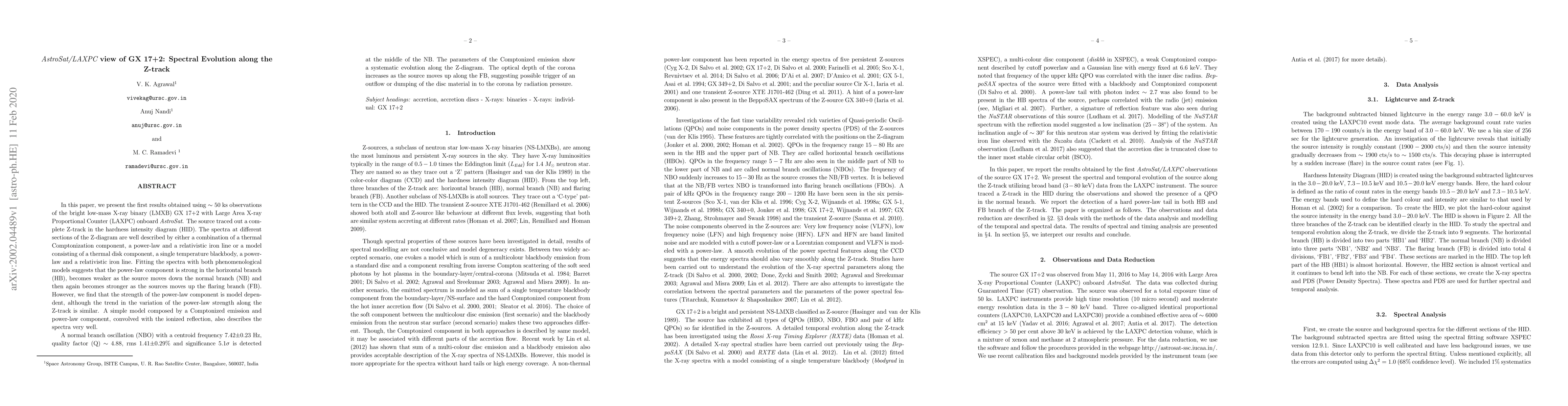 The study uses AstroSat/LAXPC to track the evolution of a bright low-mass X-ray binary (LMXB) GX 17+2 along its Z-track, revealing changes in spectral composition and hinting at possible outflows or radiation pressure triggering disc material dumping into the corona.