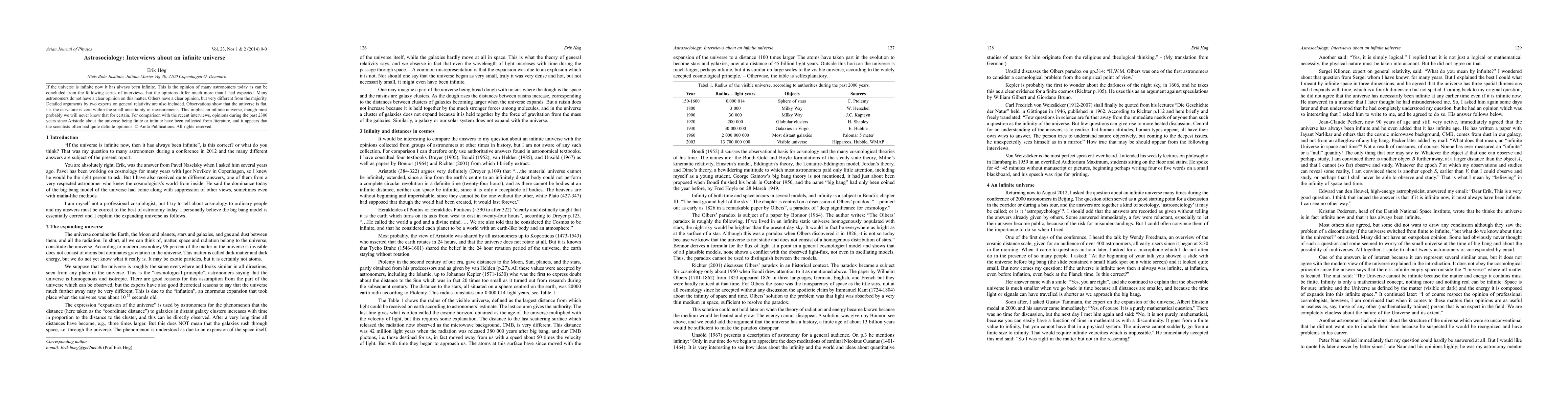 This paper presents interviews with contemporary astronomers on the infinite nature of the universe, revealing varied opinions and a lack of consensus. Historical perspectives from Aristotle to modern times are also examined, highlighting a shift from definitive past beliefs to current uncertainty.