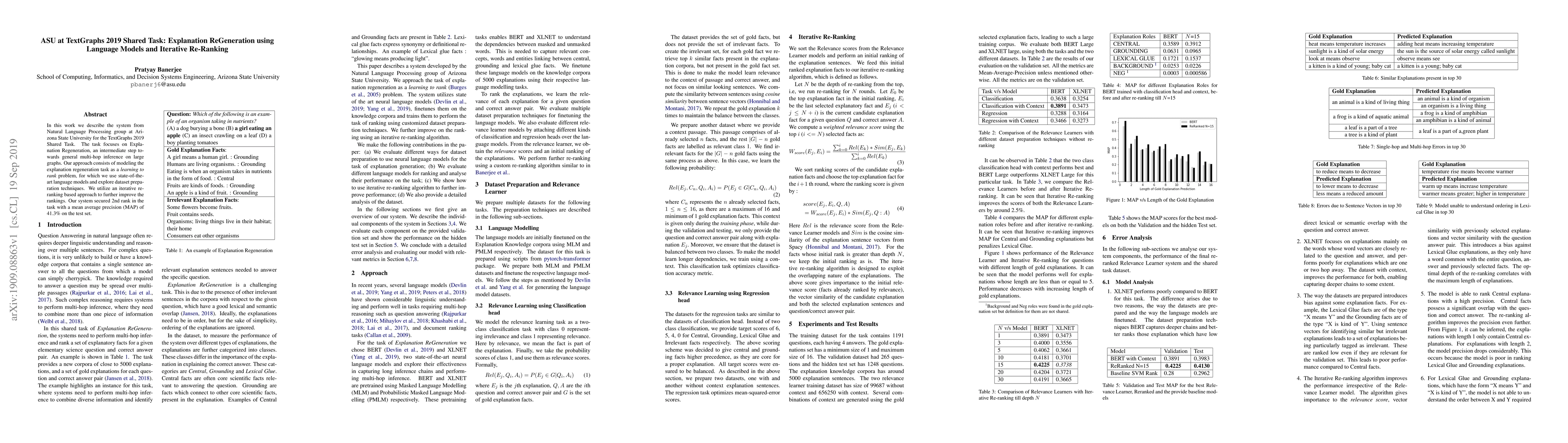 The ASU team developed a system for the TextGraphs 2019 Shared Task on Explanation ReGeneration, employing state-of-the-art language models and an iterative re-ranking method to achieve a 2nd-place finish with a mean average precision of 41.3%.