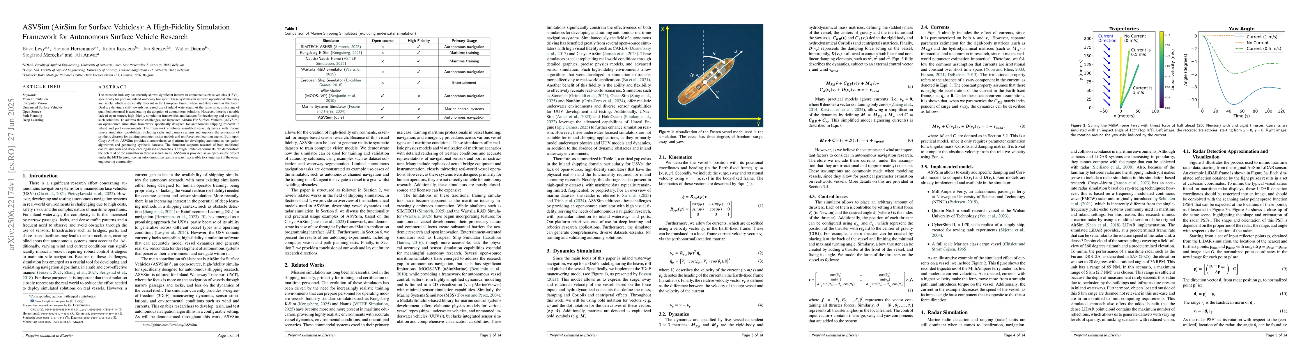 The transport industry has recently shown significant interest in unmanned surface vehicles (USVs), specifically for port and inland waterway transport. These systems can improve operational efficiency and safety, which is especially relevant in the European Union, where initiatives such as the Green Deal are driving a shift towards increased use of inland waterways. At the same time, a shortage of qualified personnel is accelerating the adoption of autonomous solutions. However, there is a notable lack of open-source, high-fidelity simulation frameworks and datasets for developing and evaluating such solutions. To address these challenges, we introduce AirSim For Surface Vehicles (ASVSim), an open-source simulation framework specifically designed for autonomous shipping research in inland and port environments. The framework combines simulated vessel dynamics with marine sensor simulation capabilities, including radar and camera systems and supports the generation of synthetic datasets for training computer vision models and reinforcement learning agents. Built upon Cosys-AirSim, ASVSim provides a comprehensive platform for developing autonomous navigation algorithms and generating synthetic datasets. The simulator supports research of both traditional control methods and deep learning-based approaches. Through limited experiments, we demonstrate the potential of the simulator in these research areas. ASVSim is provided as an open-source project under the MIT license, making autonomous navigation research accessible to a larger part of the ocean engineering community.